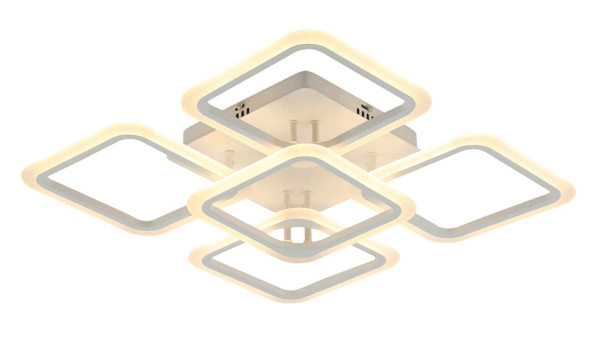 Люстра має витончений і лаконічний вигляд, що підкреслює її сучасність. Основою є металевий корпус з якісним покриттям, яке забезпечує довговічність та естетичну привабливість. Вбудовані світлодіодні елементи рівномірно розподіляють світло, створюючи комфортне освітлення без різких тіней.