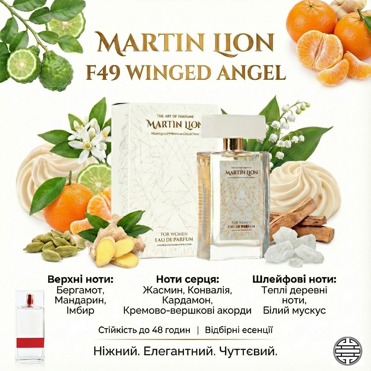 Колекція MARTIN LION – це аромати відмінної якості, яка досягається завдяки відбірним есенціям і найновішому сучасному обладнанню, що використовуються при виробництві. Жіночі парфуми MARTIN LION доступні в елегантній упаковці білого кольору з оригінальним золотим тисненням у стильних скляних флаконах. Аромати тримаються до 48 годин.