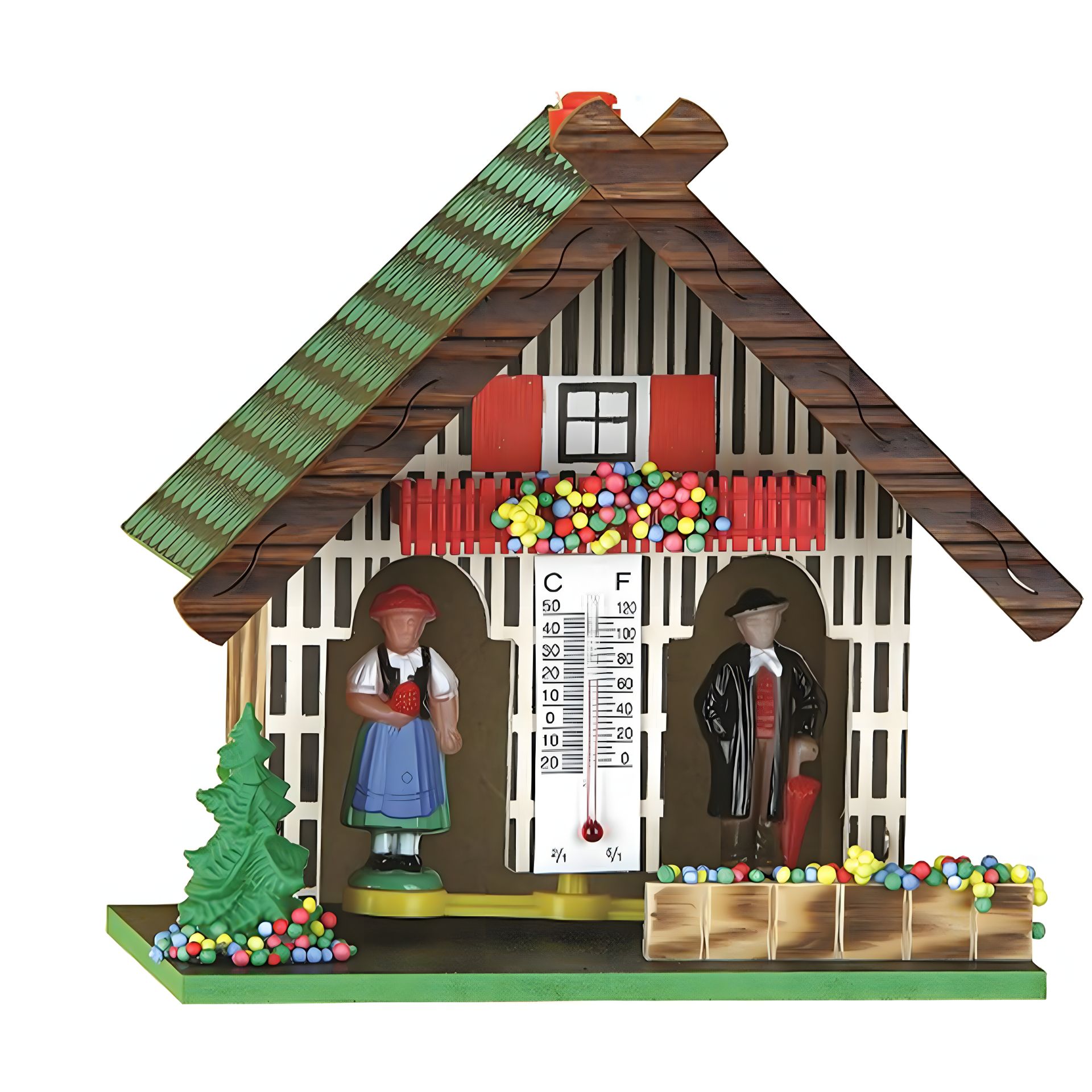 - Прогноз погоди визначається на основі барометричних даних за напрямом руху погодних фігурок відносно фасаду будиночка.