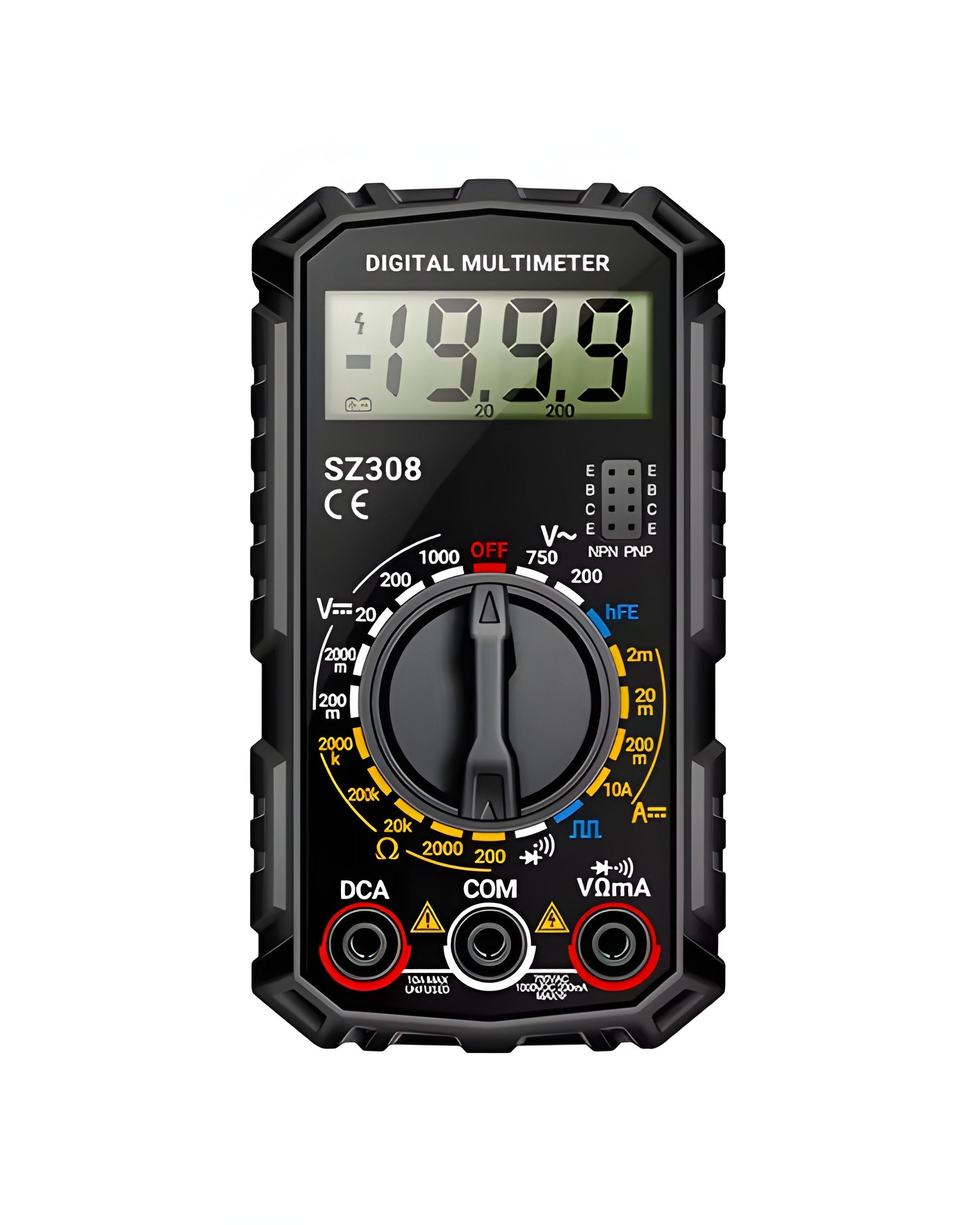 Компактний та багатофункціональний цифровий мультиметр Aneng SZ308 призначений для вимірювання постійної та змінної напруги, сили постійного струму, опору, перевірки діодів та транзисторів, а також продзвонювання ланцюгів. Пристрій відрізняється високою точністю, зручністю у використанні та компактними розмірами, що робить його чудовим вибором для домашнього та професійного застосування.