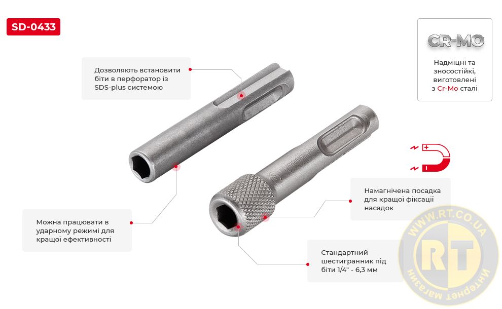 Виготовлені з надміцної та зносостійкої хром-молібденової сталі (Cr-Mo) - це дозволяє використовувати їх навіть в ударному режимі перфоратора. Витримують важкі інтенсивні навантаження. Перехідники намагнічені, тому біти не випадають і добре фіксуються.