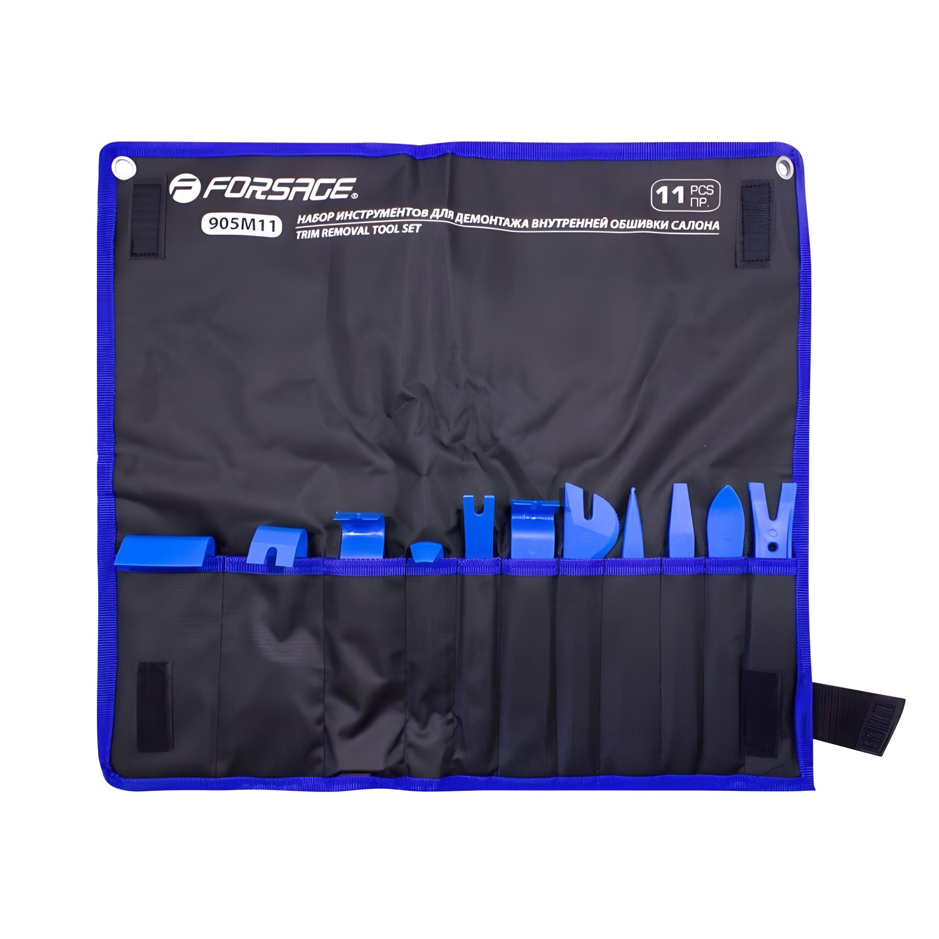 Набір пристроїв для демонтажу внутрішньої обшивки салону Forsage F-905M11 складається з 11 різних інструментів, спеціально розроблених для безпечного та надійного складання та розбирання автомобільних обшивок, пластикових кліпс, дзеркал заднього виду тощо.
