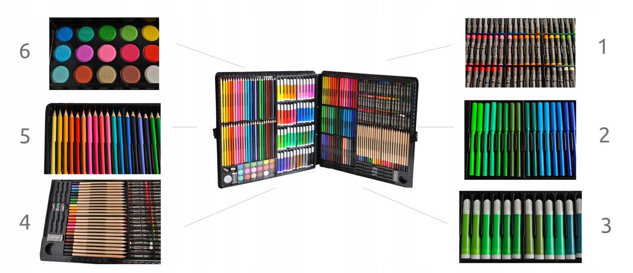 За допомогою величезного вибору з 72 крейди, 96 маркерів, 60 масляних пастелей, 18 акварельних фарб, 3 олівців, 3 кистей з ємністю для води, 30 канцелярських скріпок, точилок і 2 ластиков ми можемо легко створити найвишуканіші, креативні і оригінальні роботи. Посуд виготовлений з матеріалів хорошої якості і має широку привабливу кольорову гаму.