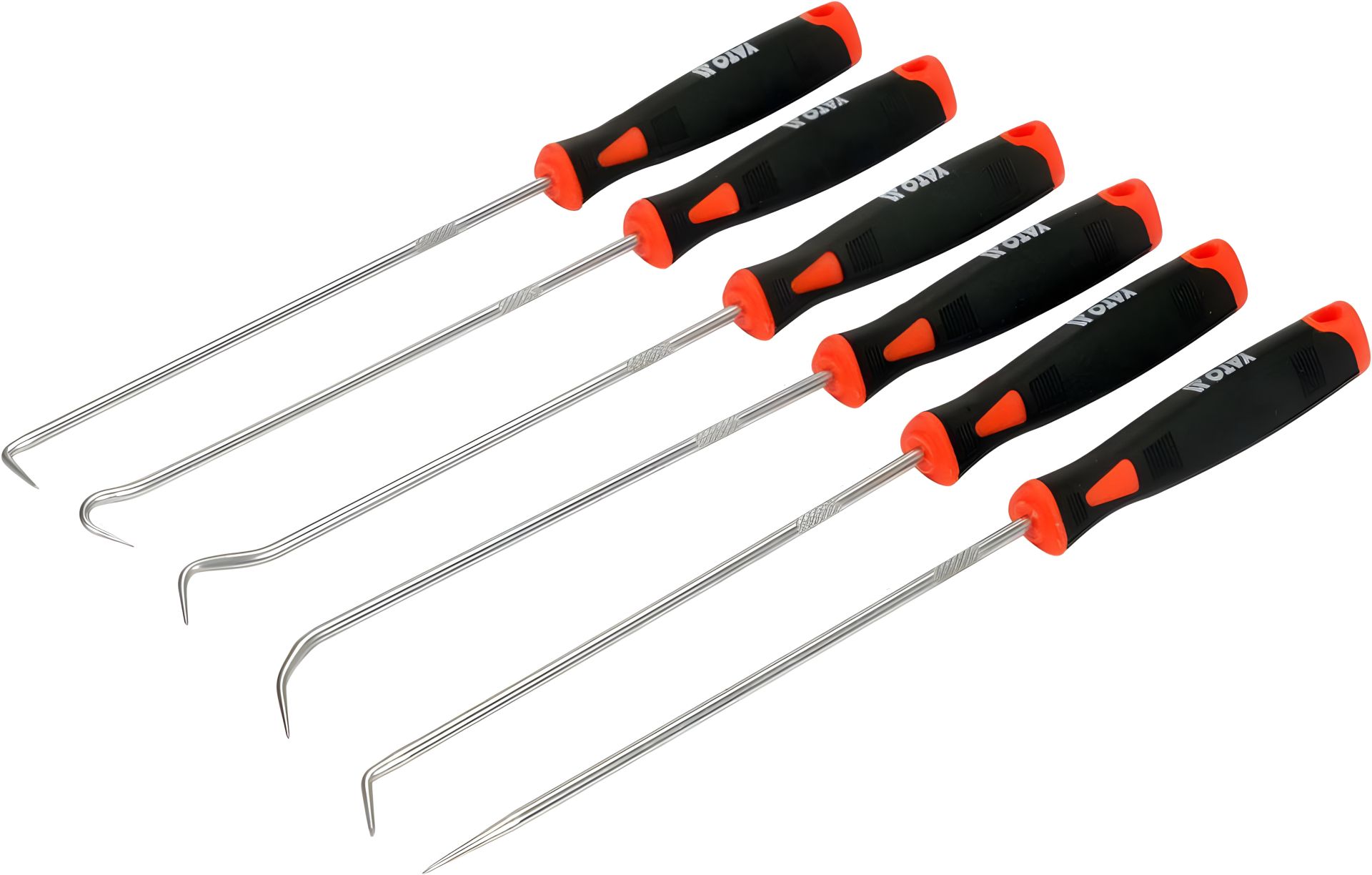 Набір гачків з ручкою має загартовані та хромовані наконечники зі сталі 40Cr. Ручка виготовлена із двокомпонентного матеріалу, що забезпечує міцний хват. Набір використовується для точних робіт, таких як: піддирка перетягування відділення компонента від металу, дерева та пластику проколювання та проштовхування в місцях, недоступних іншим інструментам. Набір рекомендований для роботи в автомобільній промисловості, обслуговуванні механізмів, послугах, будівництві.