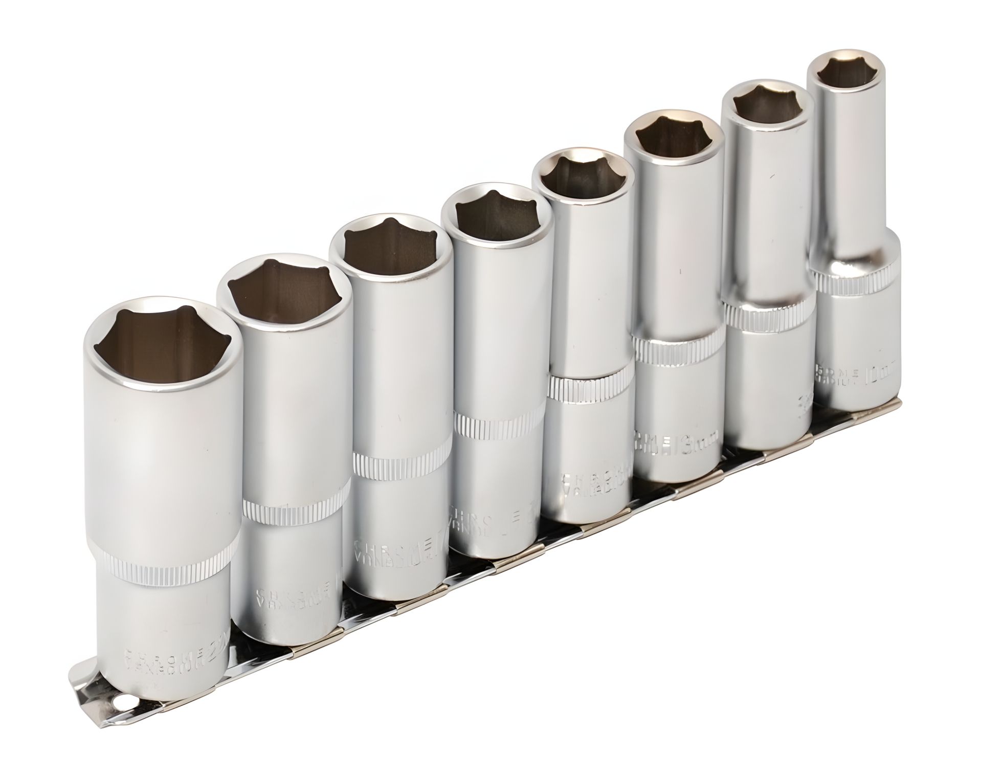 Розмір головок : 10-22 мм . Подовжена форма для роботи у важкодоступних місцях • Сумісність зі стандартними тріскачками та комірами ½" • Зручне зберігання та транспортування Цей набір стане надійним помічником у вашій майстерні! • хром-ванадієва сталь CrV • довжина насадки 78 мм • 8 шт. ½" 10, 12, 13, 14, 15, 17, 19, 22 мм