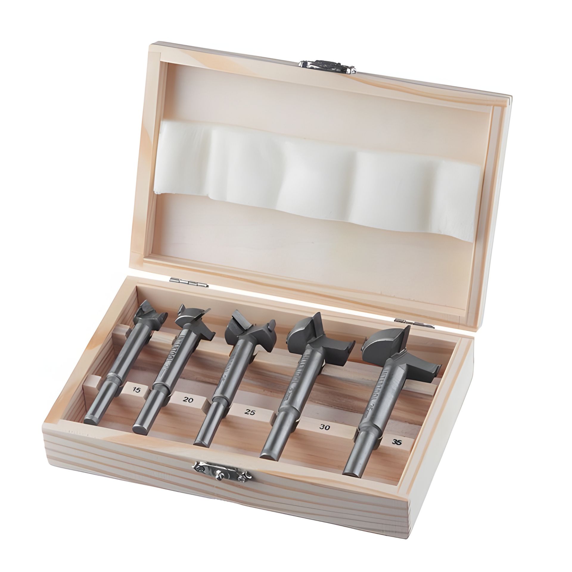 Даний набір містить 5 різних за діаметром фрез: 15, 20, 25, 30, 35 мм. Свердла Форстнера (фрези Форстнера) легко справляються з брусом, товстою фанерою або МДФ листами, робить зріз потрібного діаметра гладким та без сколів. Самовідцентроване вістря забезпечує додаткову точність свердління. Бічні різці підрізають волокна по краю, після чого різальна крайка рівно зрізує сам матеріал без деформації. Це робить отвір гладким без додаткових зусиль та витрат.