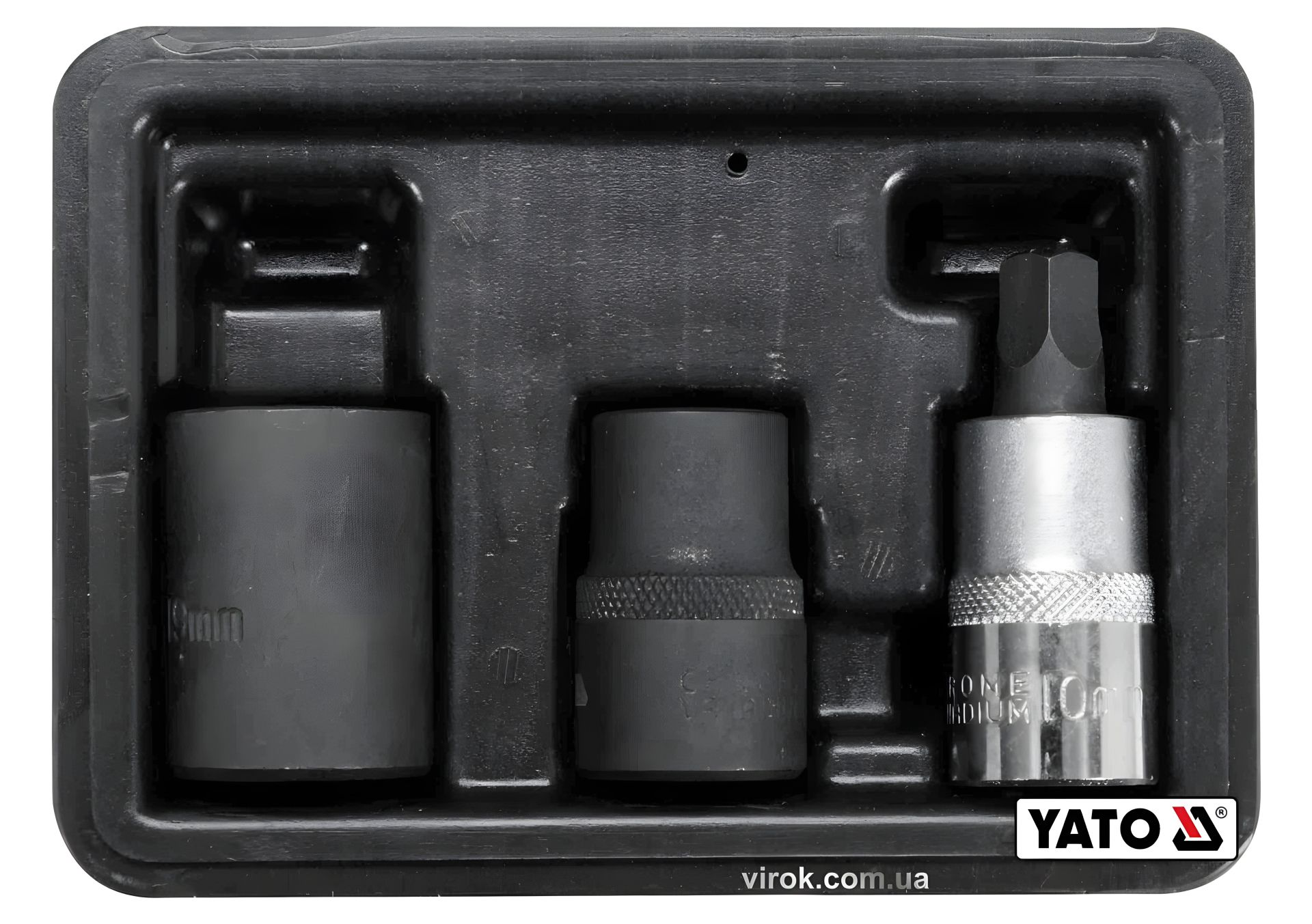 з 3 головок для обслуговування гальмівних систем Bendix і Girling. Параметри: -Упаковка: чемодан -Розмір [ мм]: 10, 14, 19 -Матеріал: CrV -Кількість елементів [шт]: 3
