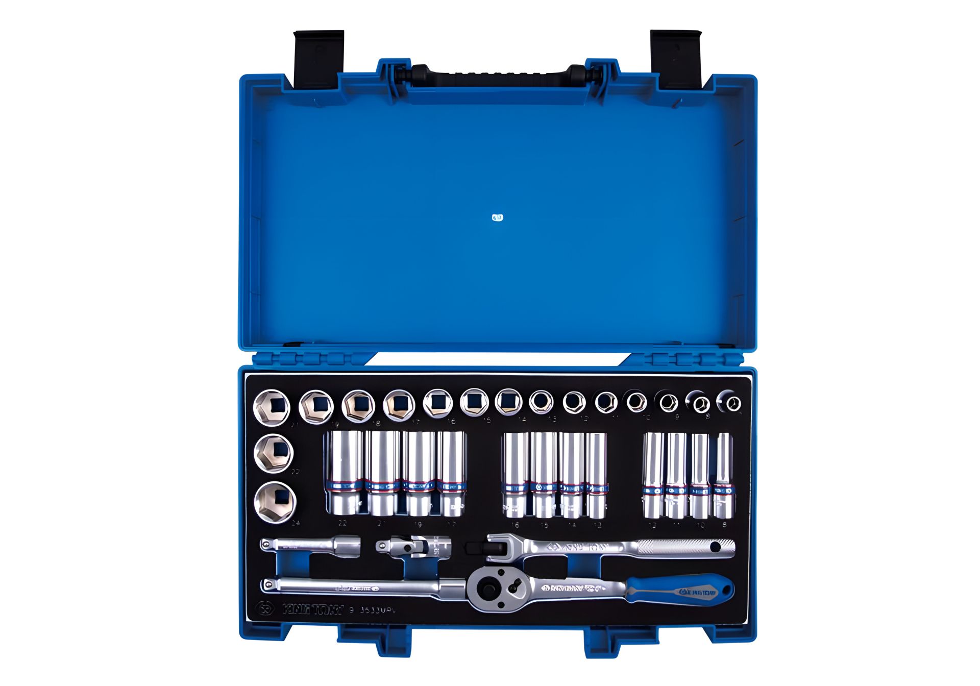 головки та приладдя виготовлені з хромованадієвої сталі високої якості, піддані додатковим обробкам для підвищення міцності та полірування. Всі вироби відповідають міжнародним стандартам 12, 13, 14, 15, 16, 17, 18 , 19, 2 1, 2 200 мм; вороток з шарніром 200 мм; подовжувачі з кульовим закінченням 75 , 150 мм; кардан 56,5 мм Пружного полімерного матеріалу, стійкого до олій та розчинників. Ложемент з інструментами також можна розміщувати в ящику інструментального візка або верстата.
