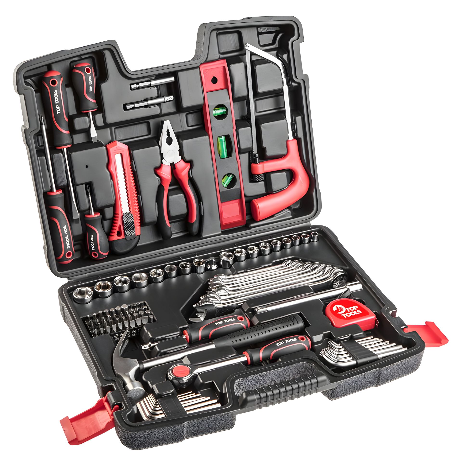 Набір інструментів 1/4”, 3/8”, 100 шт.: металева пилка 150 мм; запасне лезо для металевої пилки; молоток; однорядні плоскогубці 160 мм; храповик 3/8 нових ручки TOPTOOLS; гніздо 3/8: 10 мм, 12 мм, 13 мм, 14 мм, 15 мм, 16 мм, 17 мм, 19 мм; подовжувач 3/8 150 мм; Ручка Spiner 1/4; Адаптер 3/8x1/4; гніздо 1/4: 6 мм, 7 мм, 8 мм, 9 мм, 10 мм, 11 мм, 12 мм, 13 мм, 14 мм; Ніж шириною 18 мм; шестигранний ключ із тримачем 1,5 мм, 2 мм, 2,5 мм, 3 мм, 4 мм, 5 мм, 6 мм; шестигранник з торцевим ключем з утримувачем T10, T15, T20, T25, T27, T30, T40; комбіновані гайкові ключі: 8 мм, 10 мм, 11 мм, 12 мм, 13 мм, 14 мм, 16 мм, 17 мм, 19 мм; Викрутка PH2 190 мм; Викрутка SL6.5mm 190mm; Викрутка 83 мм PH2; Викрутка 83 мм SL6.5; Адаптер для біт; Адаптер для сокету; вимірювальна стрічка; рівень вологості; біт; SL3, SL4, SL4,5, SL5, SL5,5, SL6, SL6.5, SL7, SL8, PH0, PH1, PH2, PH3PZ0, PZ1, PZ2, PZ3, H1.5, H2, H2.5, H3, H4, H5, H6, H1/8, H9 H7/32, H1/4, H5/16, T8, T10, T15, T20, T25, T27, T30, T40, T45