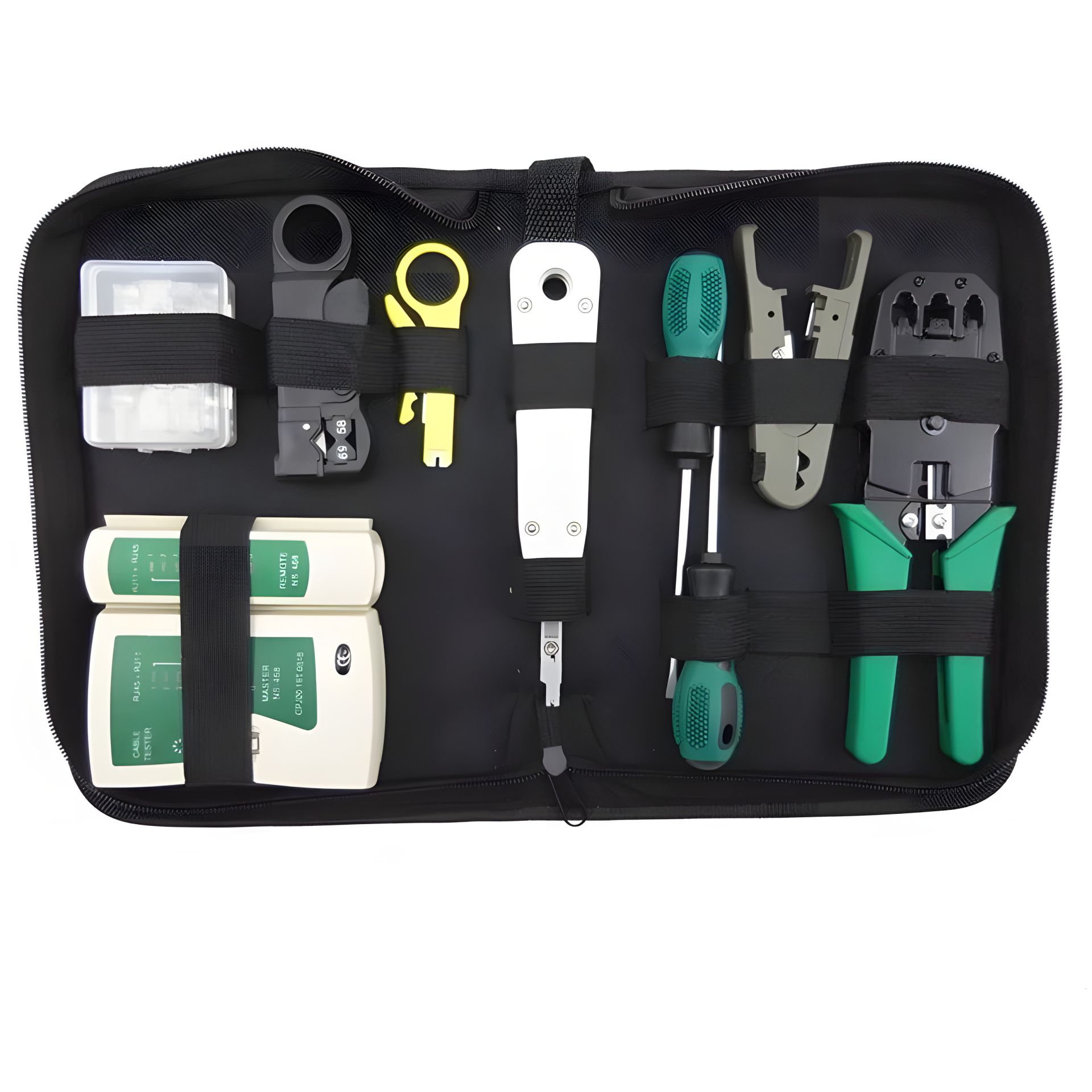 Набір інструментів для монтажу витої пари, прокладки та обслуговування мережі MHZ R11 підійде як досвідченим монтажникам мережевого обладнання, так і новачкам для обслуговування локальних мереж. У наборі 8 інструментів, якими можна виконувати основні операції з монтажу конекторів і мережевих кабелів - зачистку проводів від ізоляції, встановлення коннектора відповідного типу, монтаж в комутаційні коробки, перевірку цілісності кабелю і правильного обтискання конекторів.