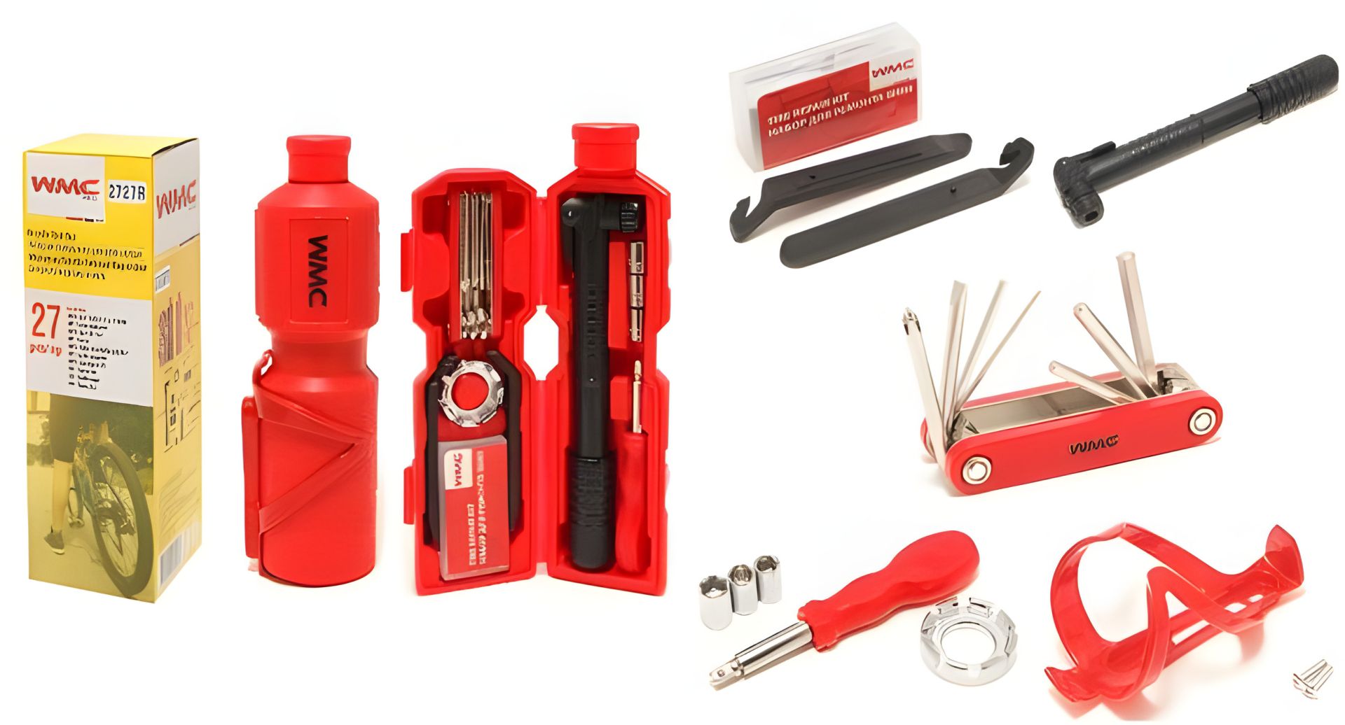 Набір інструментів WMC TOOLS для обслуговування велосипеда 27 предметів + тримач фляги, червоний.
