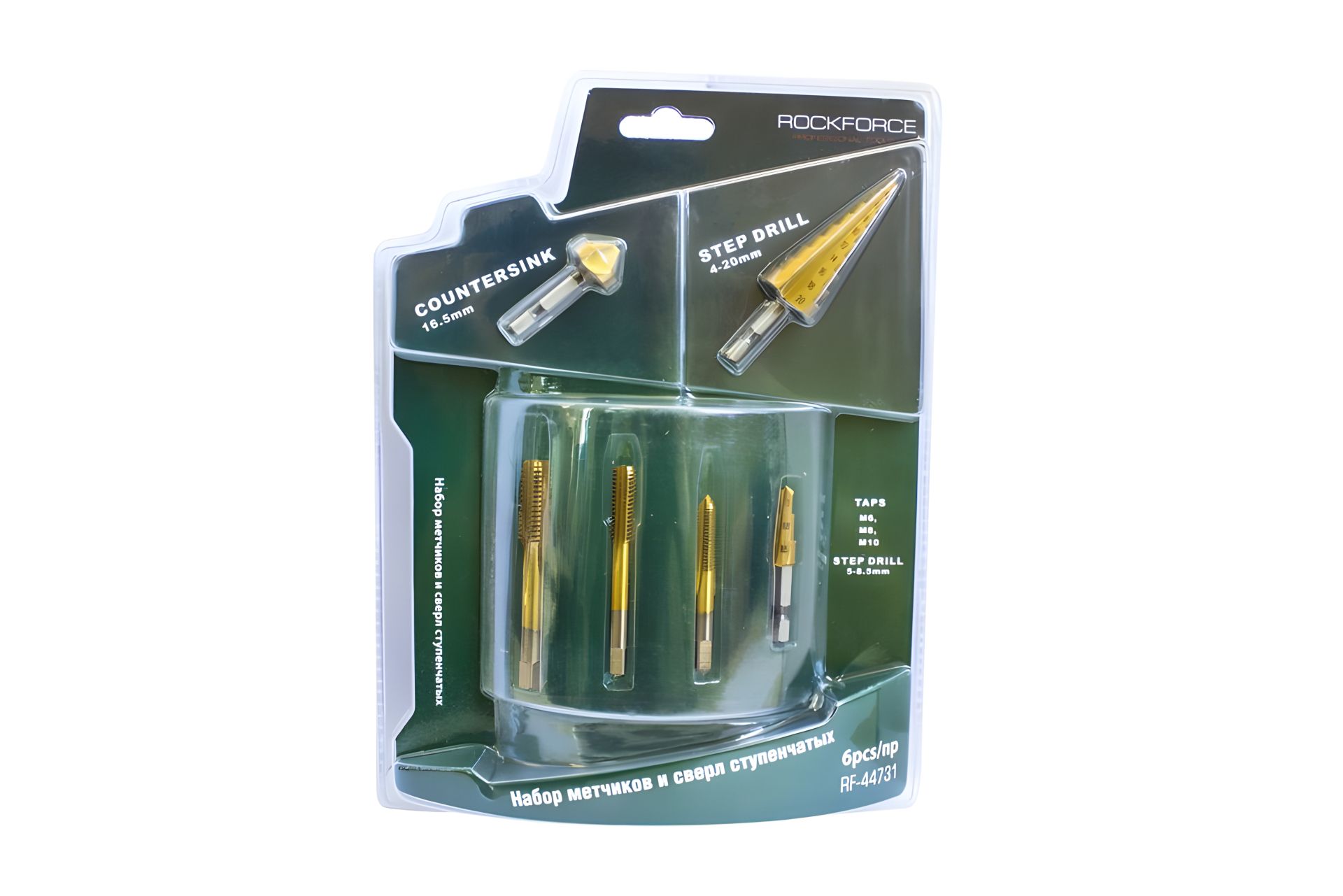 Набір RockForce RF-44731 включає шість предметів для нарізання різьблення та свердління отворів різних діаметрів: