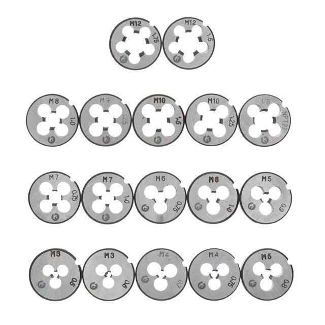 Розміри мітчиків і плашок: М3х0.5, М3х0.6, М4х0.7, М4х0.75, М5х0.8, М5х0.9, М6х1.0, М6х0.75, М7х1.0, М7х0.75, М8х1.0, М8х1.25, М10х1.25 М10х1.5; М12х1.5, М12х1.75, 1/8”-27;