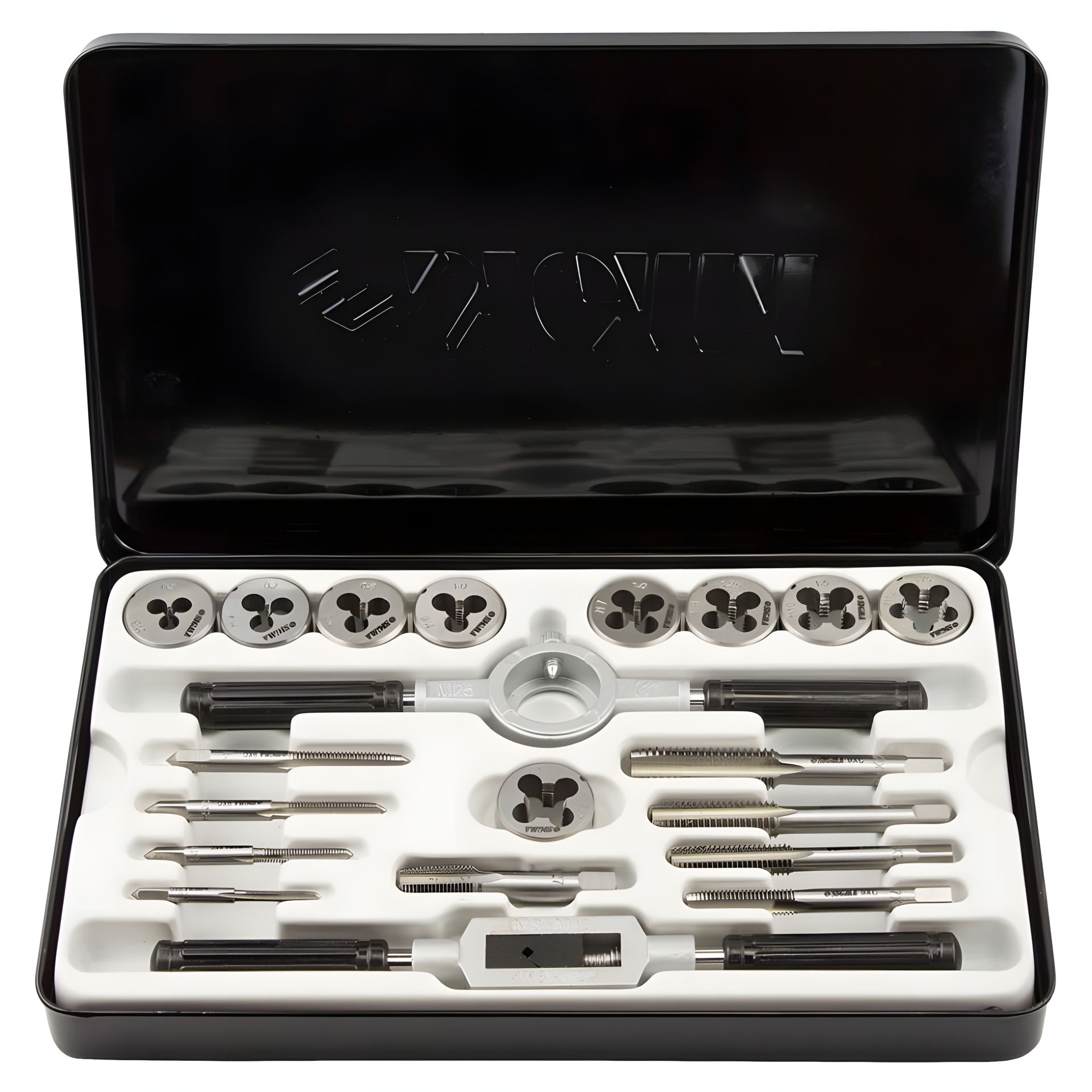 Набір плашок та мітчиків 20 предметів (металевий кейс) SIGMA (1643111) призначений для нарізування внутрішнього та зовнішнього метричного різьблення на металевих виробах, для калібрування та відновлення пошкоджених ділянок різьблення. При нарізанні, різьблення, попередньо змащують консистентним мастилом.