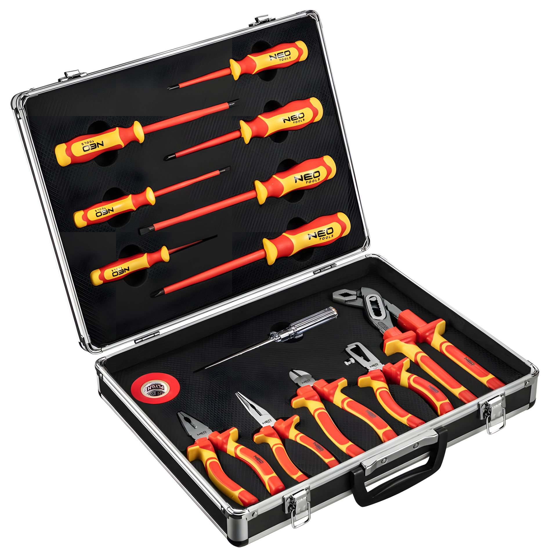 Набір інструменту 1000 В NEO із 13 елементів: у наборі в т.ч. викрутки та кусачки. Сертифіковано для роботи під напругою до 1000 В. Стрижні викрутки виготовлені з надзвичайно міцної хромомолібденової сталі. Губки із хромованадієвої сталі, ковані. Двокомпонентні, ергономічні ручки підвищують комфорт роботи. Надійність інструменту підтверджує гарантія 25 років. Бренд NEO виправдовує очікування фахівців.