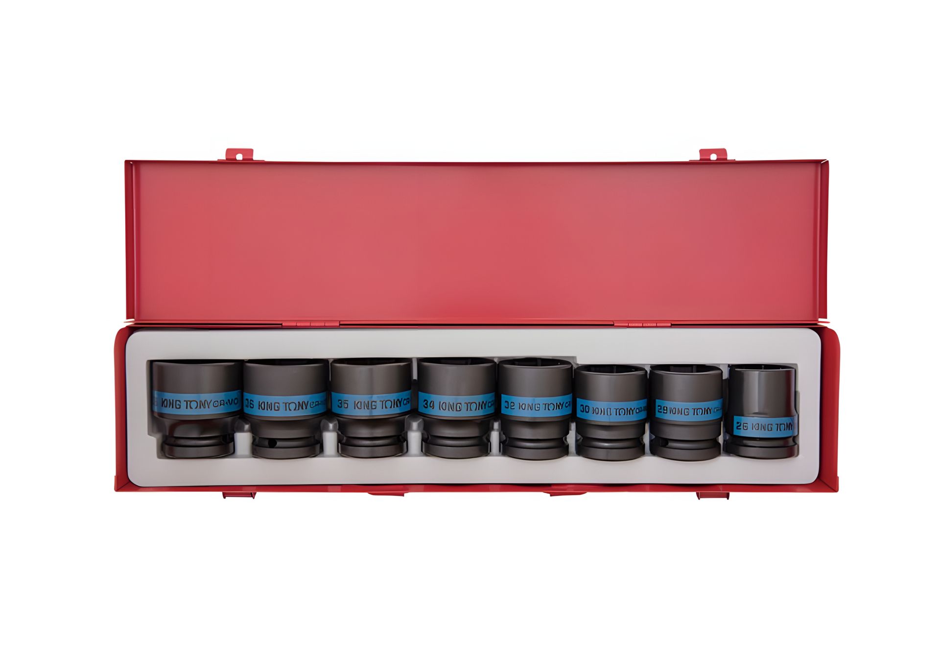 Набір ударних торцевих головок 3/4", шестигранні, 21-41 мм, 8 предметів KING TONY 6409MP03. Набір включає ударні торцеві головки, призначені для роботи з пневматичним ударним інструментом (гайковертом). навантаженням, а фосфатоване покриття захищає від корозії. Головки
