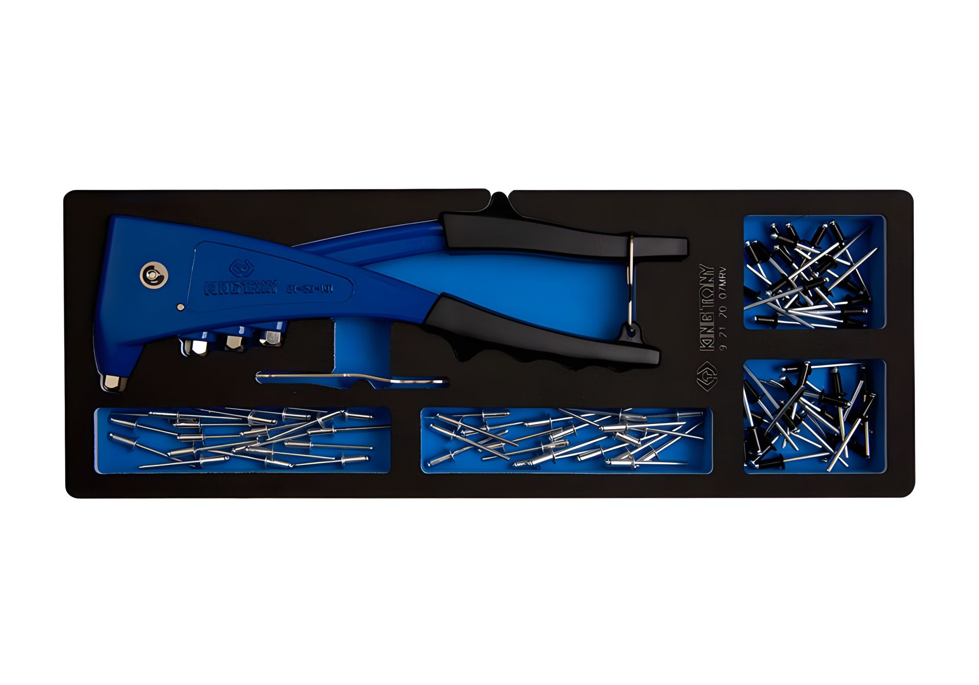 Заклепочник з набором заклепок King Tony 9-21-20-07MRV в ложементі EVA (ЕВА, полімер на основі етилену та вінілацетату) із 121 предмета, призначений для надійного скріплення матеріалів алюмінієвими заклепками.
