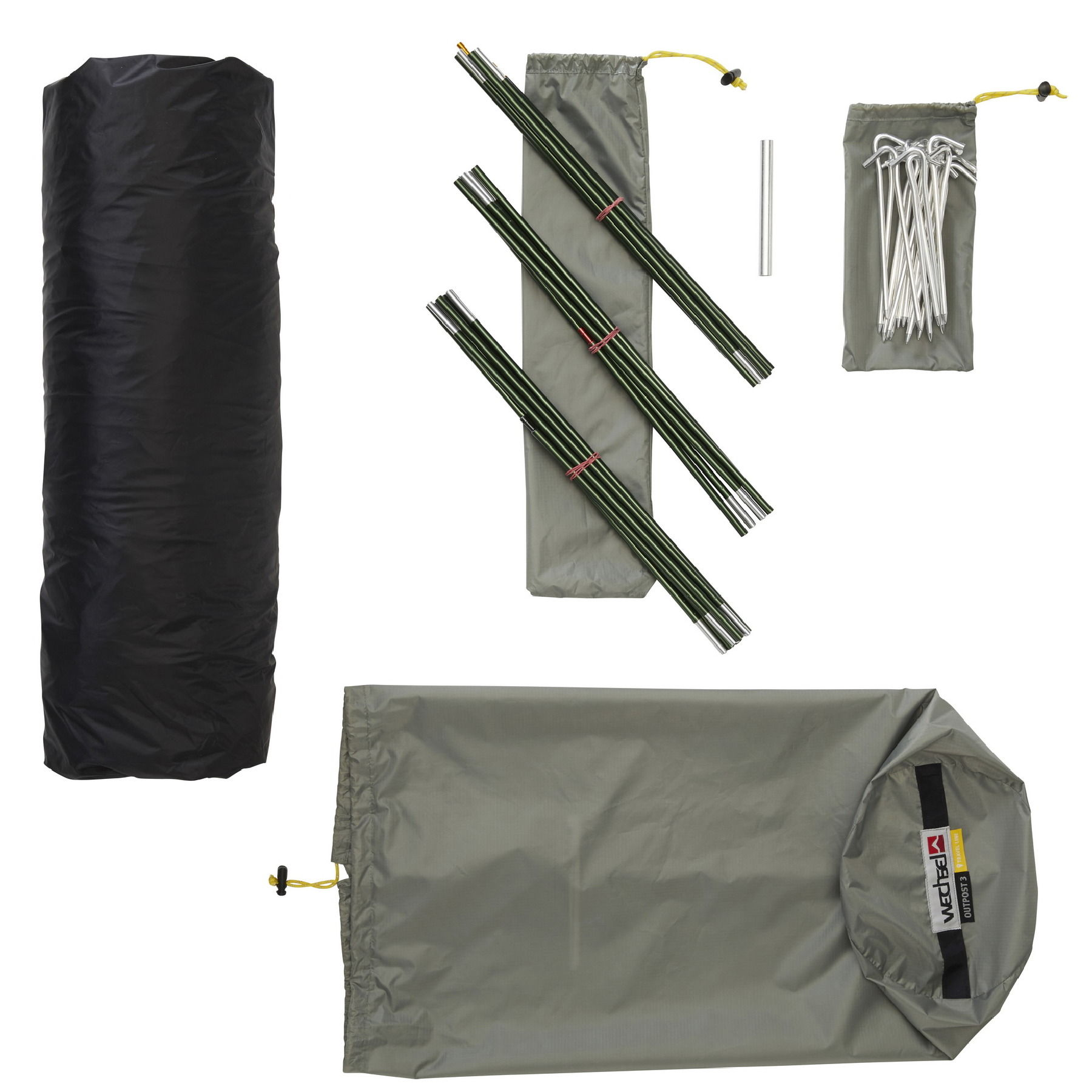 Секрет успіху цього унікального в своєму роді і багатофункціонального намету криється у великому внутрішньому просторі, який можна варіювати, і в порівняно малій власній вазі. Wechsel Outpost 3 - це чи не єдиний намет для користувачів з зростом понад 2 метри, це також незамінна модель для походів, коли необхідність у великій пощі тамбура або великої площі внутрішнього намету може змінюватися протягом походу. Асиметрична тунельна конструкція формує великий внутрішній простір. Бічні і торцеві двері забезпечують зручний вхід в намет кожного з користувачів, не порушуючи спокій сусіда. Бічний вхід зовнішнього тенту оснащений повноцінною москітною сіткою. Торцевої вхід може бути використаний як велике панорамне вікно, а торцева двері, зафіксовані розтяжками на стійках або трекінгових палицях (купуються окремо), формують великий навіс від сонця або опадів. Поліуретанове покриття тенту і дна намету забезпечує водозахист до 7000 мм і високу стійкість до проколів, що вельми важливо при використанні намети, як в лісистій, так і на кам'янистій місцевості. Додаткова підлога (купується окремо) захищає основну підлогу намету від пошкоджень і формує підлогу тамбура.