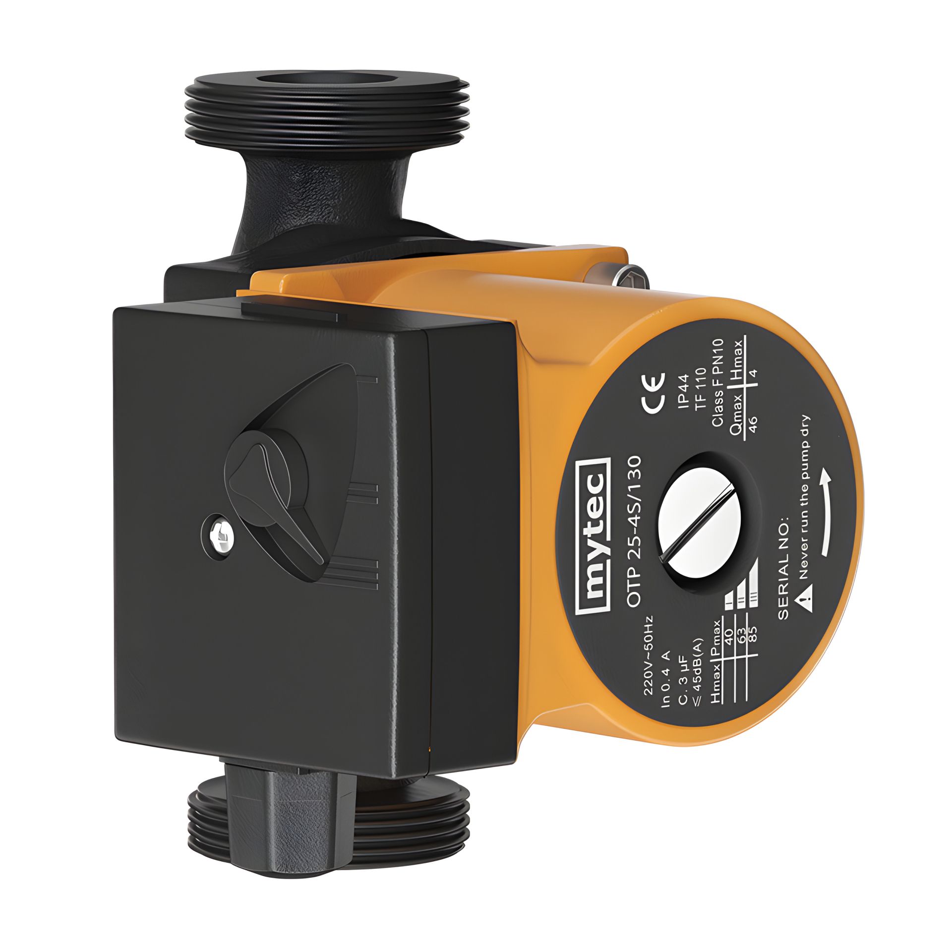 Циркуляційний насос Mytec OTP 4/25S 130 призначений для примусової циркуляції рідини (теплоносія) у системах опалення, охолодження і гарячого водопостачання в житлових та комерційних будівлях. Циркуляційний насос допомогає забезпечити рівномірний розподіл тепла або охолодження у системі та збільшує ефективність опалення та охолодження. Крильчатка насосу виконана з технополімеру Noryl PPO, котрий характеризується високою термостійкістю, низьким рівнем водопоглинання та високою ударною міцністю. Монолітна відшліфована гільза ротора забезпечує низький рівень шуму під час роботи циркуляційного насоса. Також у насосі використовується керамічний вал та мідна обмотка статора, це все сприяє тривалому терміну служби насоса. В комплекті з насосом йде конденсатор ємністю 2,5 мікрофарад, що підвищує його продуктивність. Основні характеристики Mytec OTP 4/25S 130: Потужність: 85 Вт Довжина бази: 130 мм Максимальна висота підняття: 4 м Максимальна продуктивність: 46 л/хв Максимальна температура рідини: +110°С Тип електродвигуна: асинхронний, трьохшвидкісний, безшумний Обмотка статора: мідь Гільза статора електродвигуна: нержавіюча сталь Підшипник: керамічний радіальний Клас ізоляції: Н Клас захисту: IP44