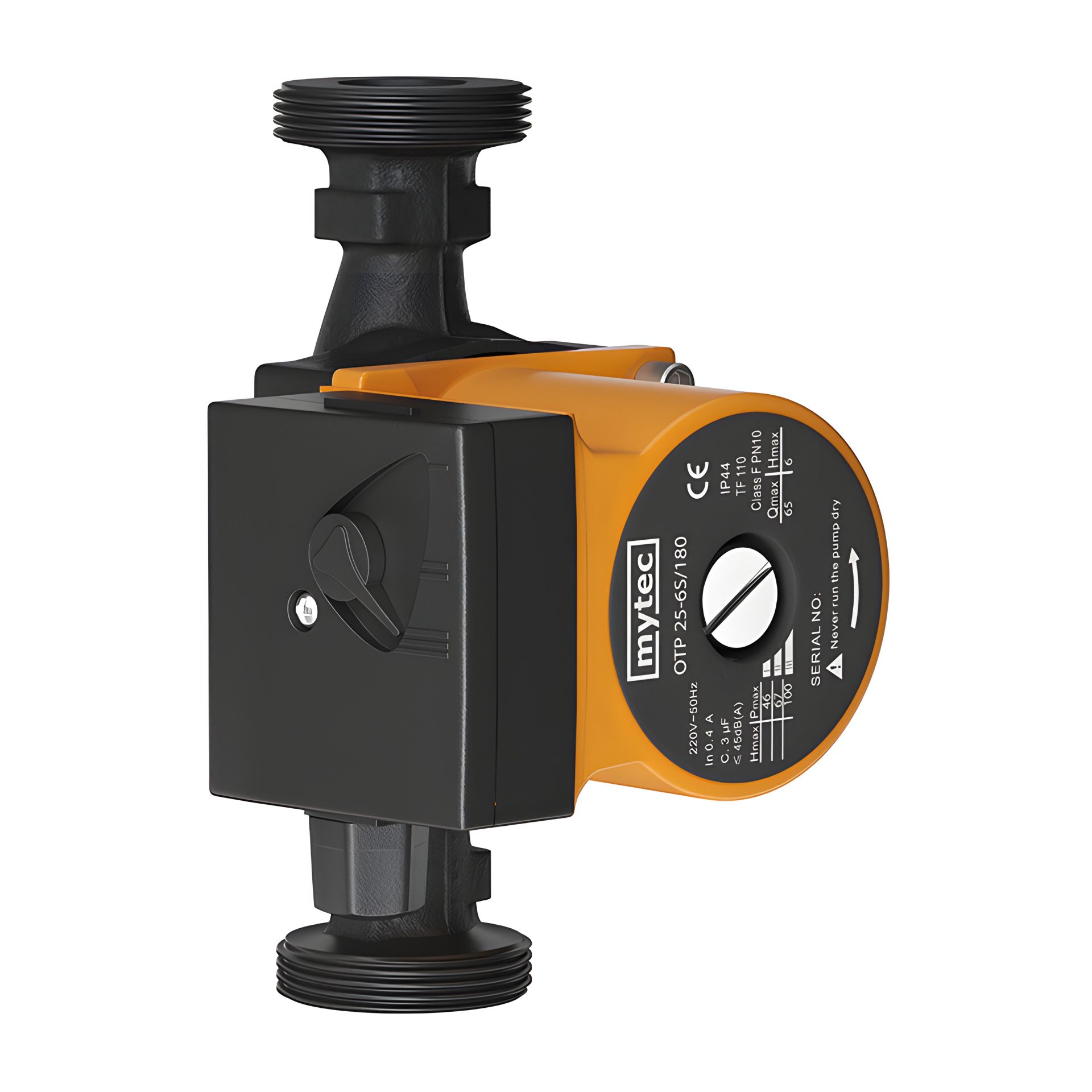 Циркуляційний насос Mytec OTP 6/25S 180 призначений для примусової циркуляції рідини (теплоносія) у системах опалення, охолодження і гарячого водопостачання в житлових та комерційних будівлях. Циркуляційний насос допомогає забезпечити рівномірний розподіл тепла або охолодження у системі та збільшує ефективність опалення та охолодження. Крильчатка насосу виконана з технополімеру Noryl PPO, котрий характеризується високою термостійкістю, низьким рівнем водопоглинання та високою ударною міцністю. Монолітна відшліфована гільза ротора забезпечує низький рівень шуму під час роботи циркуляційного насоса. Також у насосі використовується керамічний вал та мідна обмотка статора, це все сприяє тривалому терміну служби насоса. В комплекті з насосом йде конденсатор ємністю 2,5 мікрофарад, що підвищує його продуктивність. Основні характеристики Mytec OTP 6/25S 180: Потужність: 100 Вт Довжина бази: 180 мм Максимальна висота підняття: 6 м Максимальна продуктивність: 65 л/хв Максимальна температура рідини: +110°С Тип електродвигуна: асинхронний, трьохшвидкісний, безшумний Обмотка статора: мідь Гільза статора електродвигуна: нержавіюча сталь Підшипник: керамічний радіальний Клас ізоляції: Н Клас захисту: IP44