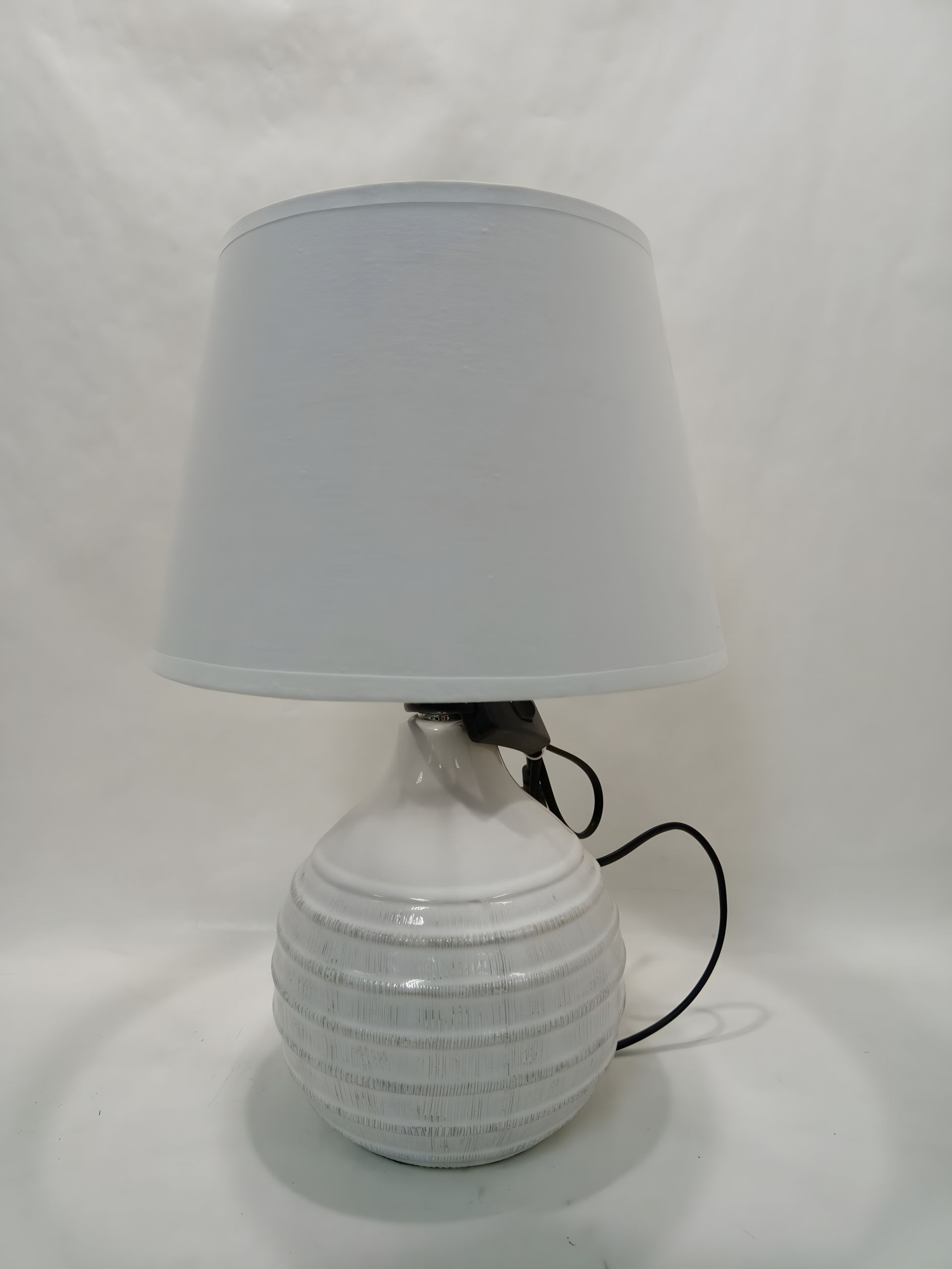 Лампа має керамічну основу в білому кольорі, яка виглядає стримано та водночас розкішно. Білий текстильний абажур м’яко розсіює світло, створюючи комфортну атмосферу для читання, роботи або відпочинку.