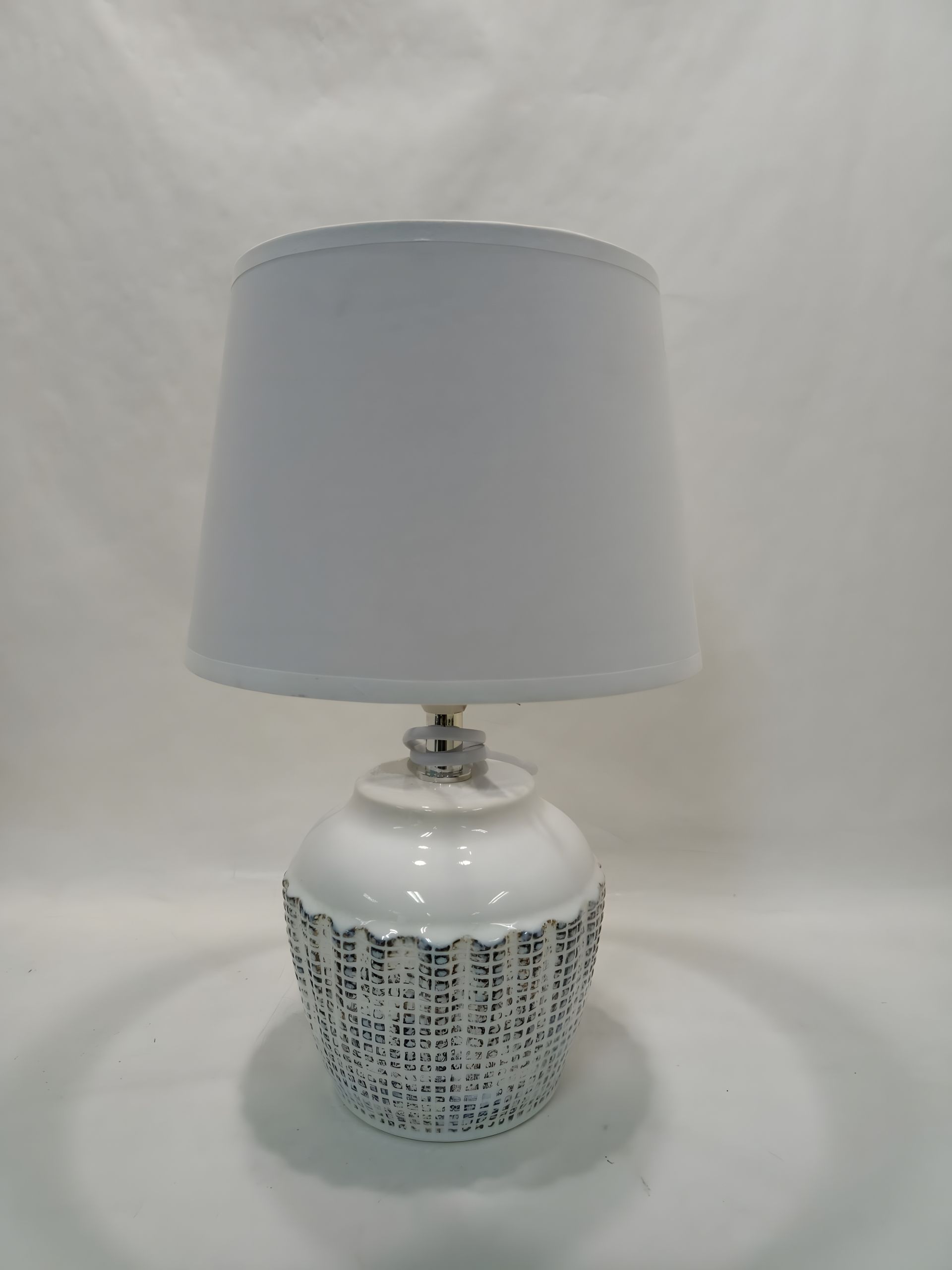 Лампа має керамічну основу в білому кольорі декором, яка виглядає стримано та водночас розкішно. Білий текстильний абажур м’яко розсіює світло, створюючи комфортну атмосферу для читання, роботи або відпочинку.