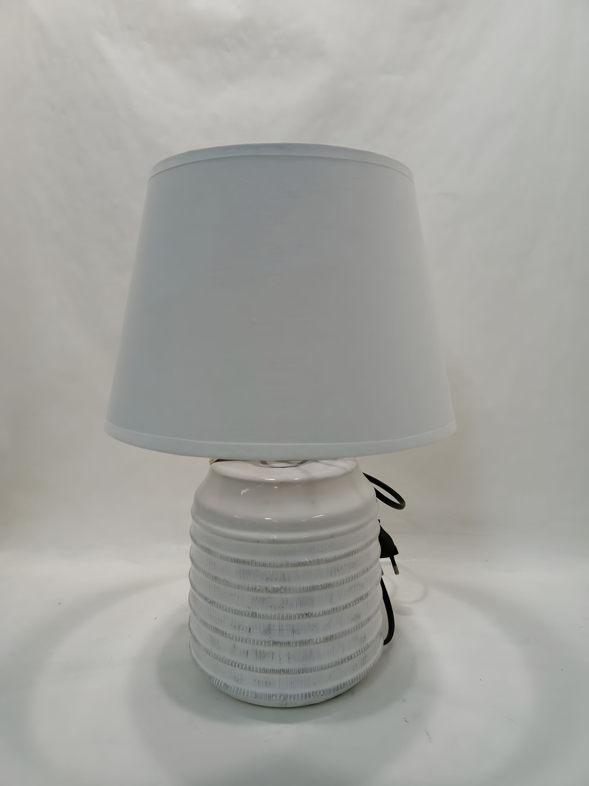 Лампа оснащена цоколем E14, що дозволяє використовувати енергоощадні або світлодіодні лампочки, забезпечуючи комфортне та м’яке освітлення. Текстильний абажур рівномірно розсіює світло, додаючи приміщенню тепла та гармонії.