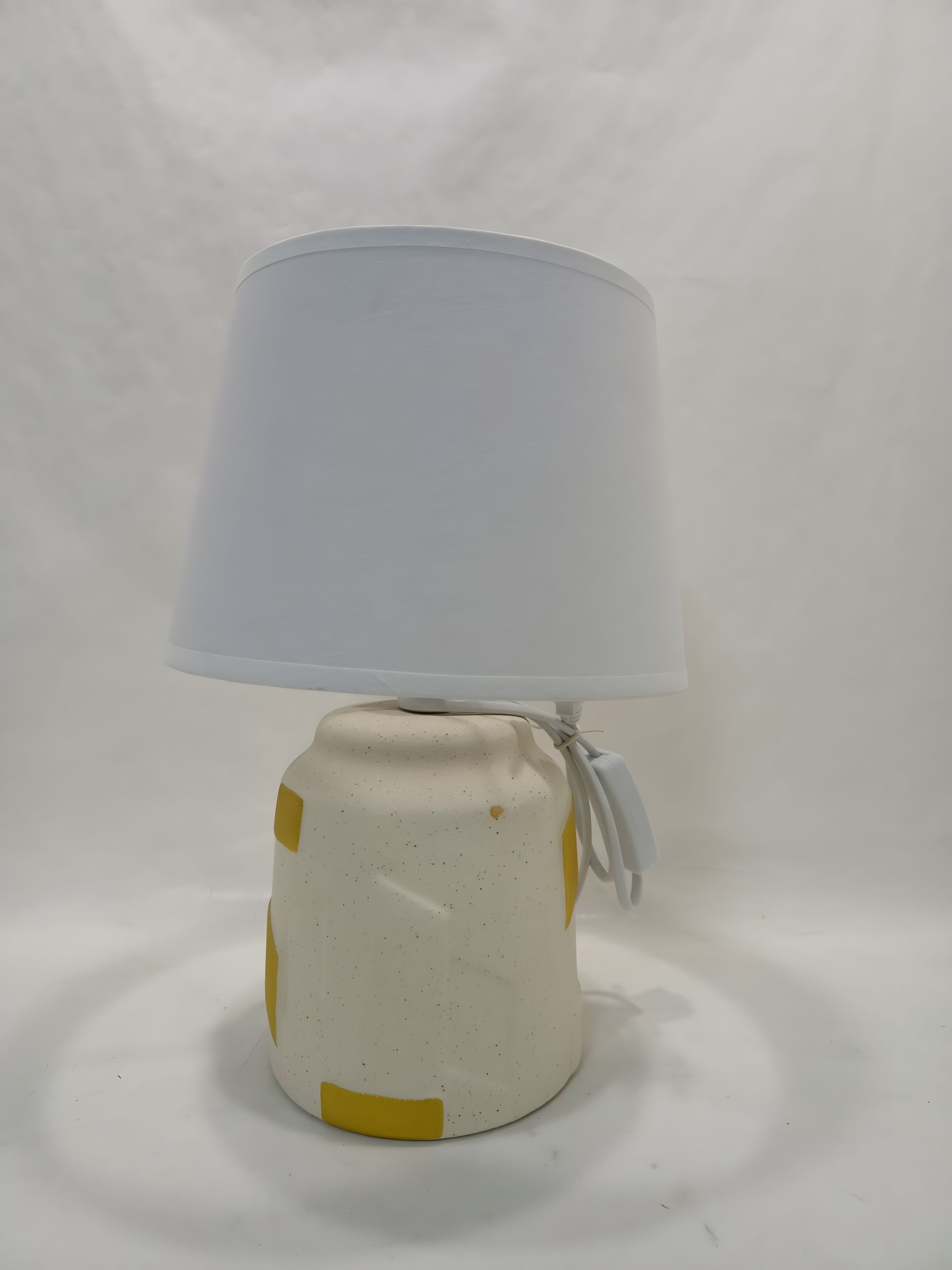 Лампа має керамічну основу в кольорі кольорі пустельного піску з жовтим декором, яка виглядає стримано та водночас розкішно. Білий текстильний абажур м’яко розсіює світло, створюючи комфортну атмосферу для читання, роботи або відпочинку.