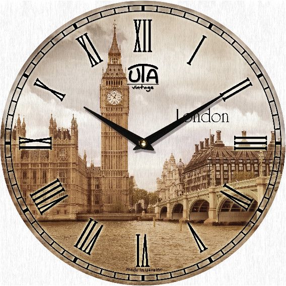 Настінний годинник UTA "Vintage" (33 см) 012 VT "Лондон" - Вони мають круглу форму, діаметр 33 см, товщина 2,7 см, вага 0,6 кг.