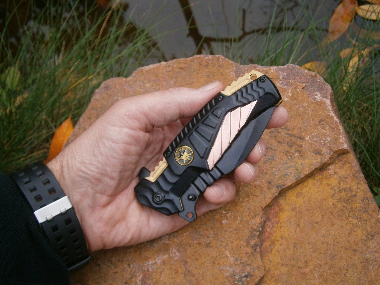 Ручка ножа виконана із металу , що робить її міцною і стабільною. Рукоять оснащена кліпсою для носіння на ремені, системі моллі, кишені і т.п.