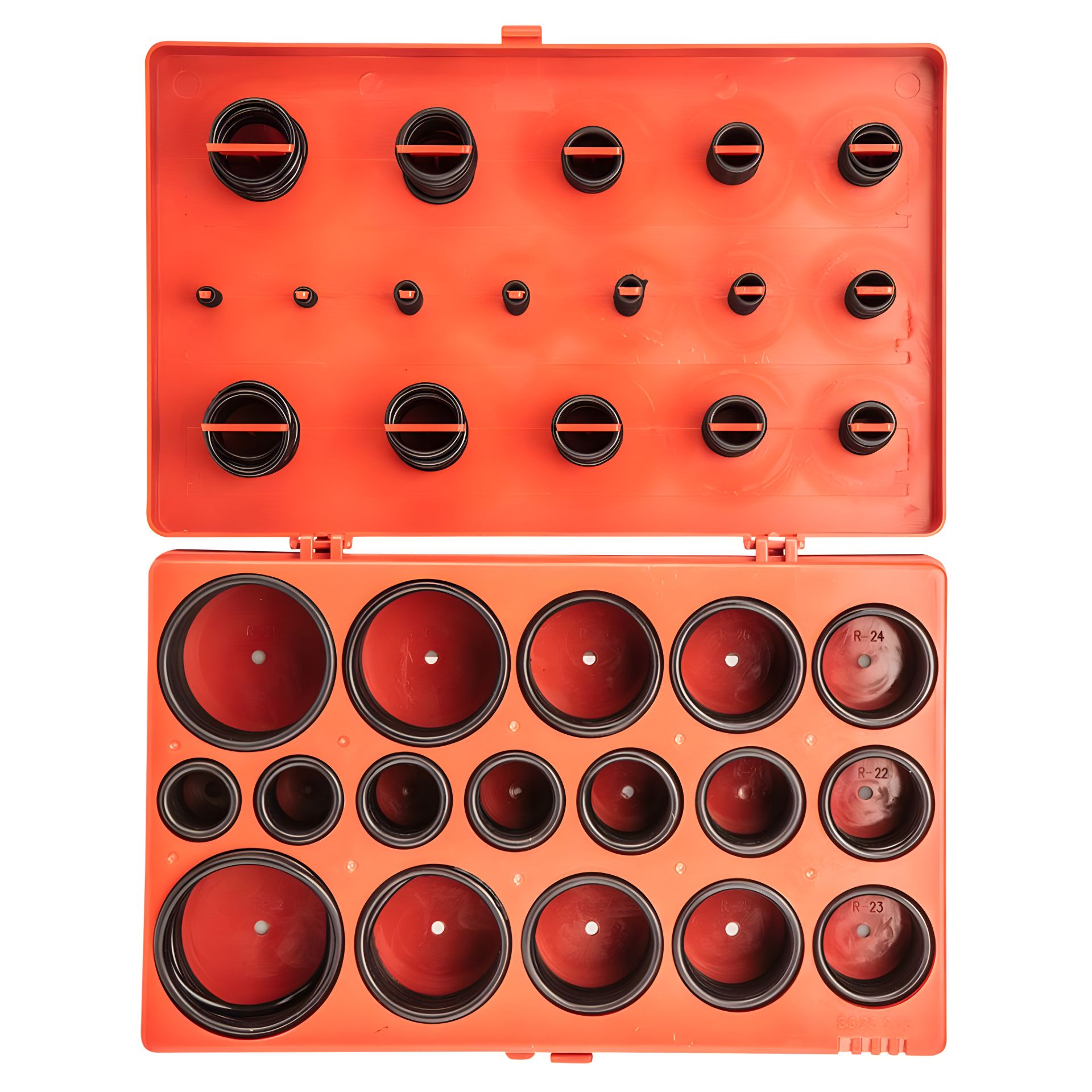 О-подібні кільця: 20 x (3x6x1.5 мм), 20 x (4.4x8.4x2 мм), 18 x (5x9x2 мм), 23 x (7x10x1.5 мм), 23 x (10x13x1.5 мм), 23 x (13x15x16x1. мм), 13 x (11x16x2.5 мм), 14 x (13x18x2.5 мм), 13 x (14x19x2.5 мм), 14 x (16x21x2.5 мм), 14 x (18x23x2.5 мм), 13 x (19x24) (21x26x2.5 мм), 13 x (22x27x2.5 мм), 10 x (18x25x3.5 мм), 10 x (20x27x3.5 мм), 10 x (22x29x3.5 мм), 10 x (23.5x30.5x3.5x3.5x3). мм. (36x43x3.5 мм), 10 x (38x45x3.5 мм), 10 x (41x48x3.5 мм), 10 x (44x51x3.5 мм), 10 x (47x54x3.5 мм), 10 x (50x57x3.5 мм)