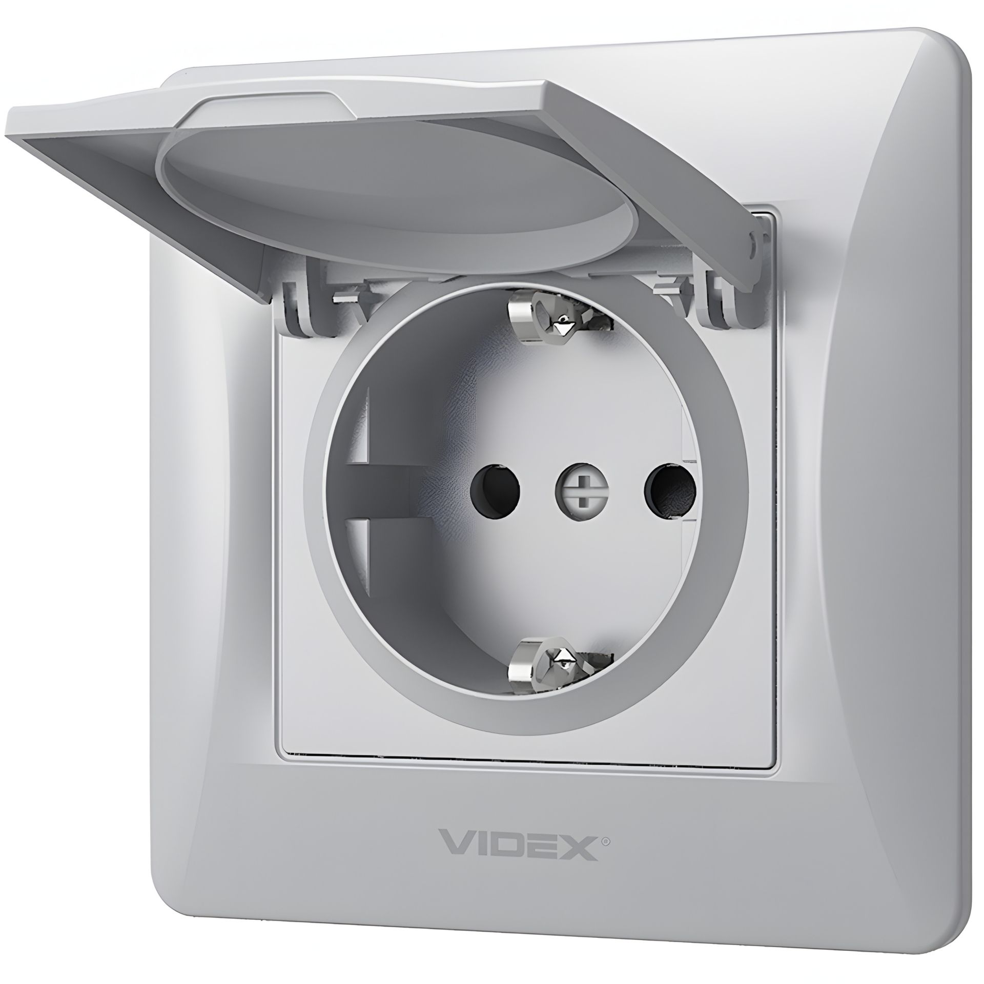 Одинарна розетка із заземленням, кришкою та підвищеною вогнетривкістю VIDEX BINERA VF-BNSK1GС-SS срібляста
