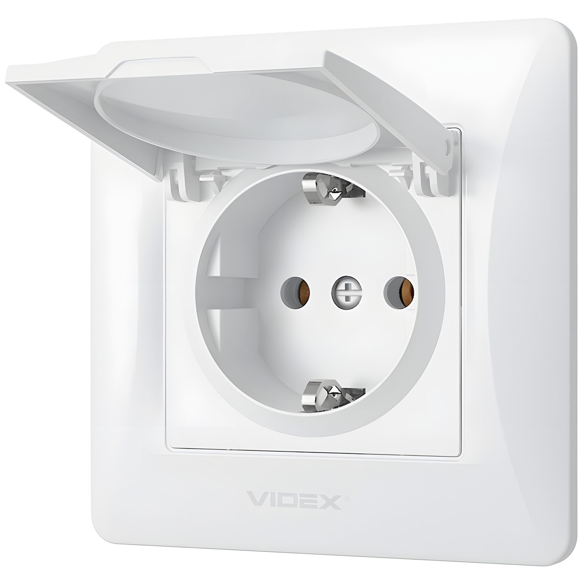Розетка одинарна з заземленням, кришкою і підвищеною огнеупорністю VIDEX BINERA VF-BNSK1GС-W біла