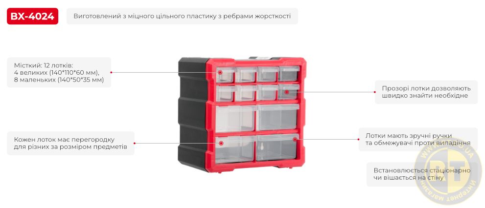 Органайзер виготовлений з міцного пластику і вміщує 12 лотків: 4 великих (140*110*60 мм), 8 маленьких (140*50*35 мм).