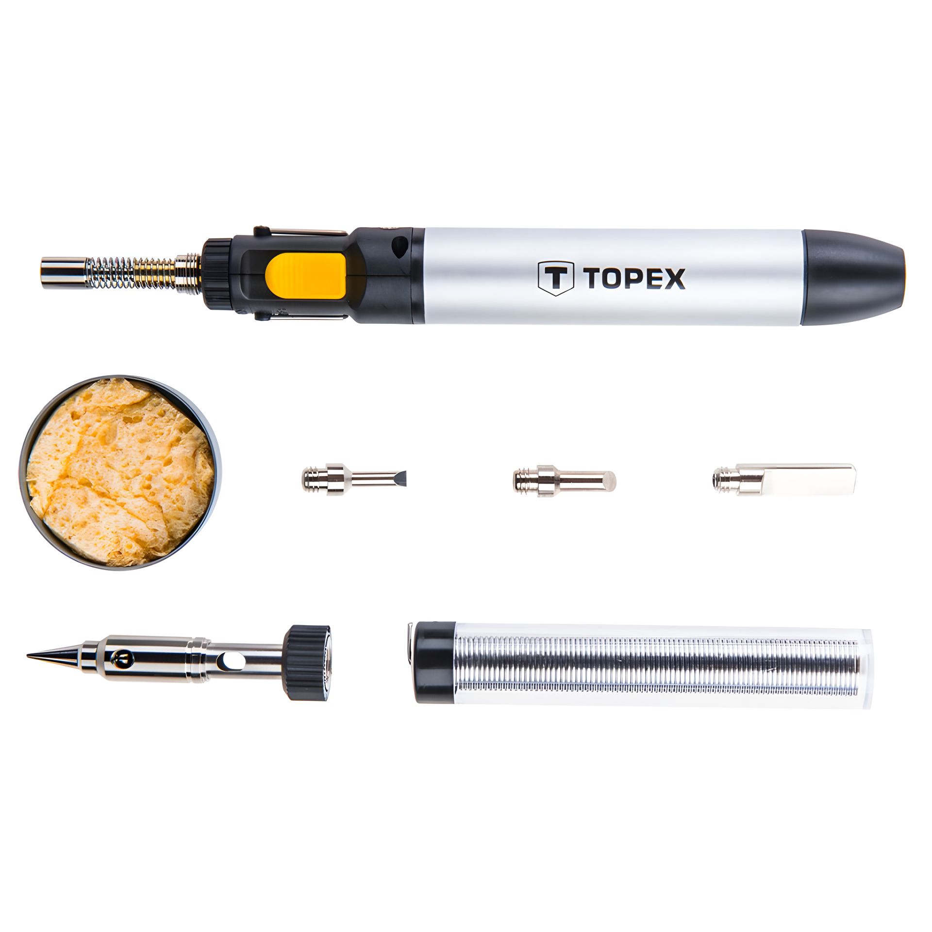 Мікропальник TOPEX із робочою температурою 400°C. Має безпечний блокатор кнопки включення та регулювання розміру полум'я. Продається в наборі з чотирма паяльними насадками та олов'яним припоєм. Об'єм ємності для газу - 12 мл. Міцний корпус гарантує безпеку та надійність. Набір упакований у коробку для зручного зберігання. Бренд TOPEX призначений для домашніх майстрів.