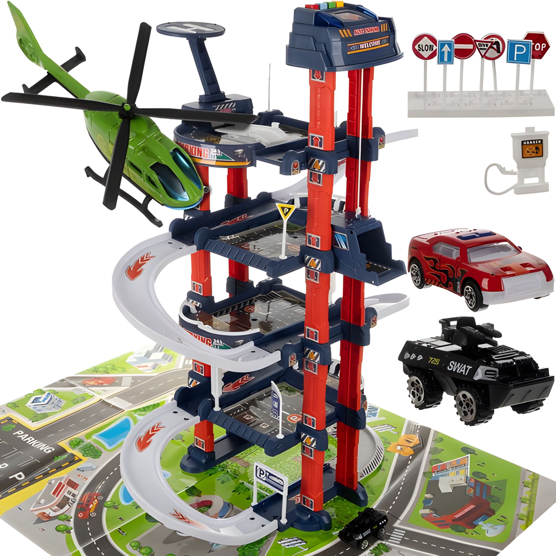 - ДОПОВНЕННЯ - до комплекту входить дошка з якісного АБС, що відтворює інфраструктуру міста , на якій треба розмістити гараж і розмістити дорожні знаки. Дошка додає реалізму та розширює можливості гри , даючи змогу будувати власні маршрути та сценарії. До комплекту входить: дві машини — перегонова та бойова машина - и вертоліт який виготовлені з міцних матеріалів PS і ABS . Дорожні знаки встановлені дає змогу створити персоналізовану й безпечну дорожню інфраструктуру. Кожен можливий рівень паркування Крім того, обклейте його наклейками, що входять до комплекту, та встановіть дорожні знаки та розмітку , що дасть змогу дітям повністю адаптувати зовнішній вигляд гаража під свої потреби та переваги.