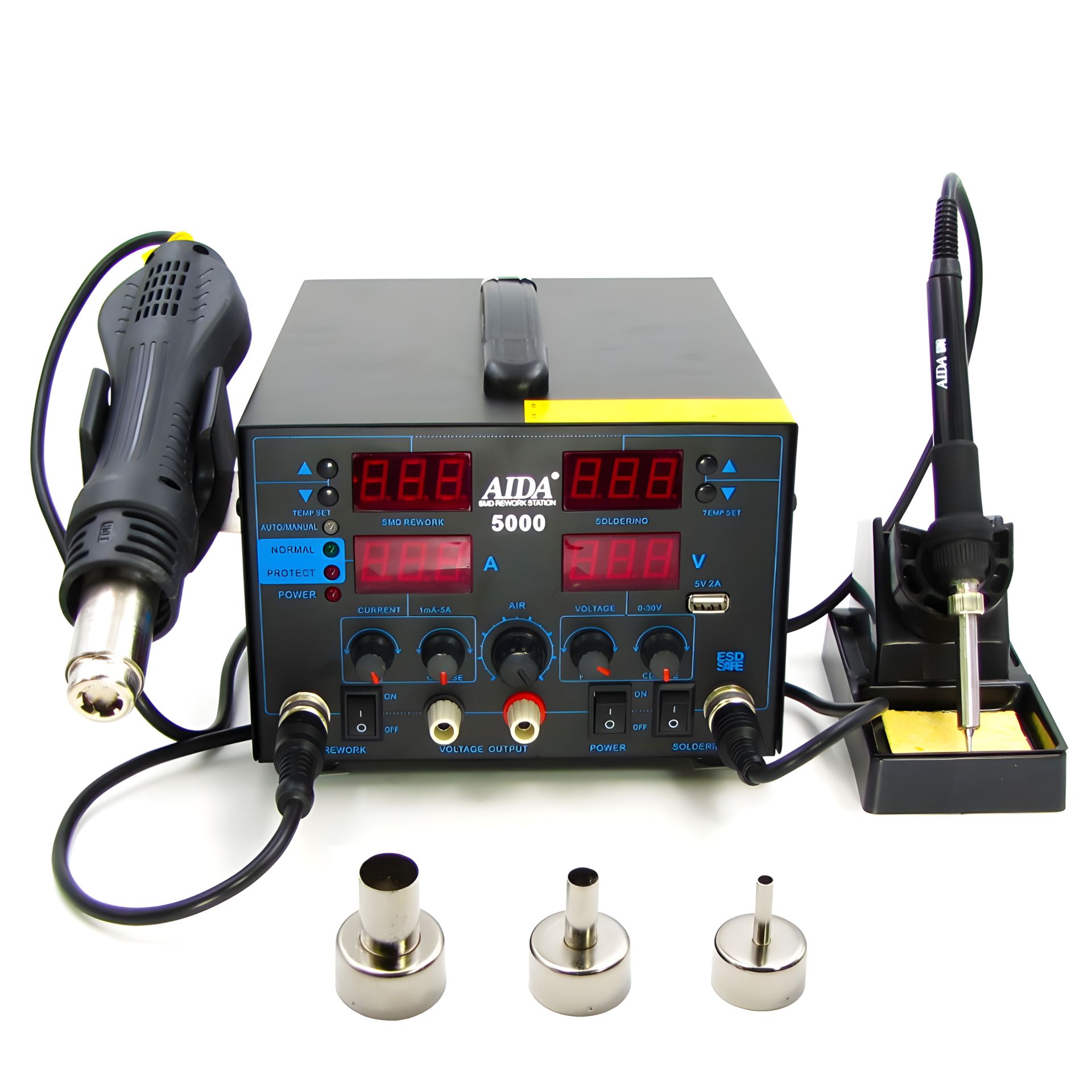 Aida 5000 паяльна станція з феном, паяльником, блоком живлення 30V 5A, USB A 5V 2A, цифрова індикація