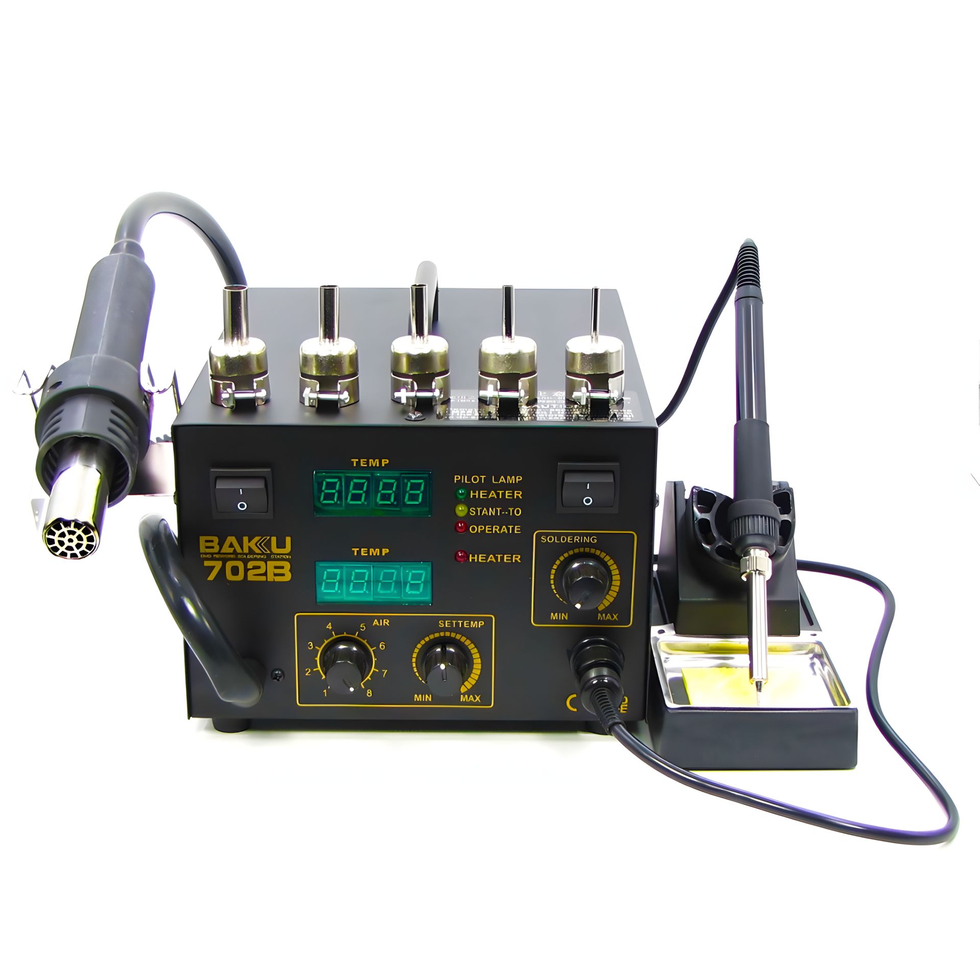Паяльна станція BAKU BK702B / BK702L - це професійне обладнання для паяння та демонтажу компонентів на друкованих платах, що ідеально підходить для майстерень, сервісних центрів та радіолюбителів. Пристрій оснащений термофеном та паяльником, працює на базі компресора, і дозволяє точно та безпечно працювати з елементами будь-якої складності: від SMD-компонентів до BGA-мікросхем. Управління мікропроцесором забезпечує точне налаштування температури та стабільність нагріву.