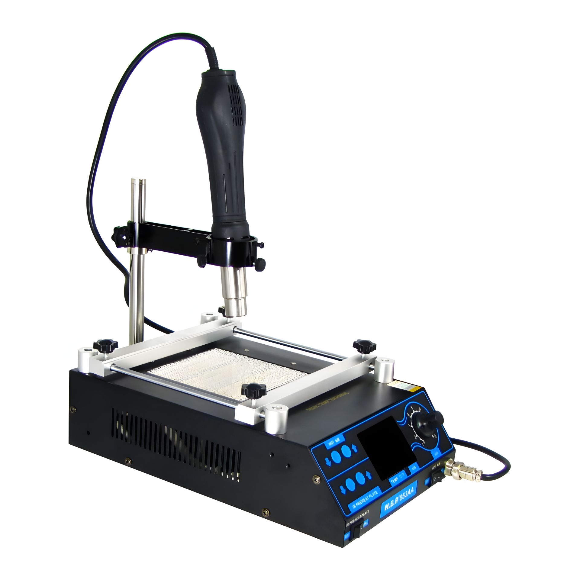 WEP 853AA – це професійна інфрачервона паяльна станція з нижнім переднагріванням та термофеном, розроблена для високоточного монтажу та демонтажу компонентів на друкованих платах. Завдяки інтеграції ІЧ-підігрівача та турбінного термофена, пристрій ідеально підходить для роботи з мікросхемами типів SMD, QFP, PLCC, BGA та іншими чутливими до перегріву елементами.