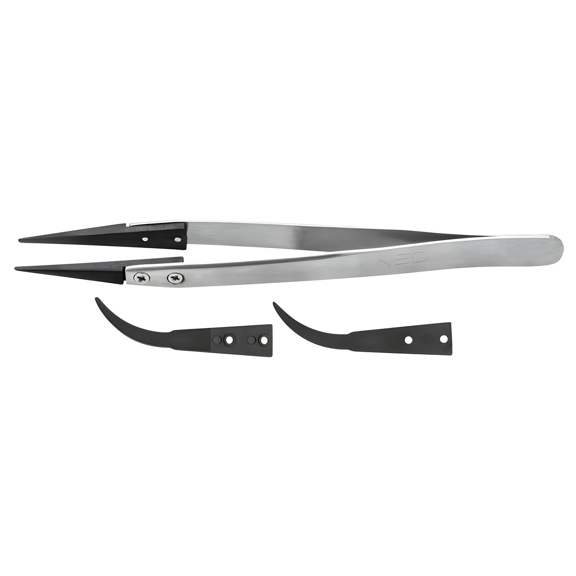 Пінцет NEO 06-120, NEO, використовується для сервісної роботи на смартфонах, планшетах та ноутбуках. Насамперед, для електронників та людей, які професійно займаються даним видом робіт. Пінцет призначений для захоплення дрібних елементів усередині телефону, ноутбука або планшета. Це дозволяє прецизійно виконувати роботу. Пінцет має 2 пари змінних наконечників різної форми, що дозволяє їх підібрати, щоб можна було легко дістатися навіть до важкодоступних місць. Пінцет забезпечує зручність у роботі.
