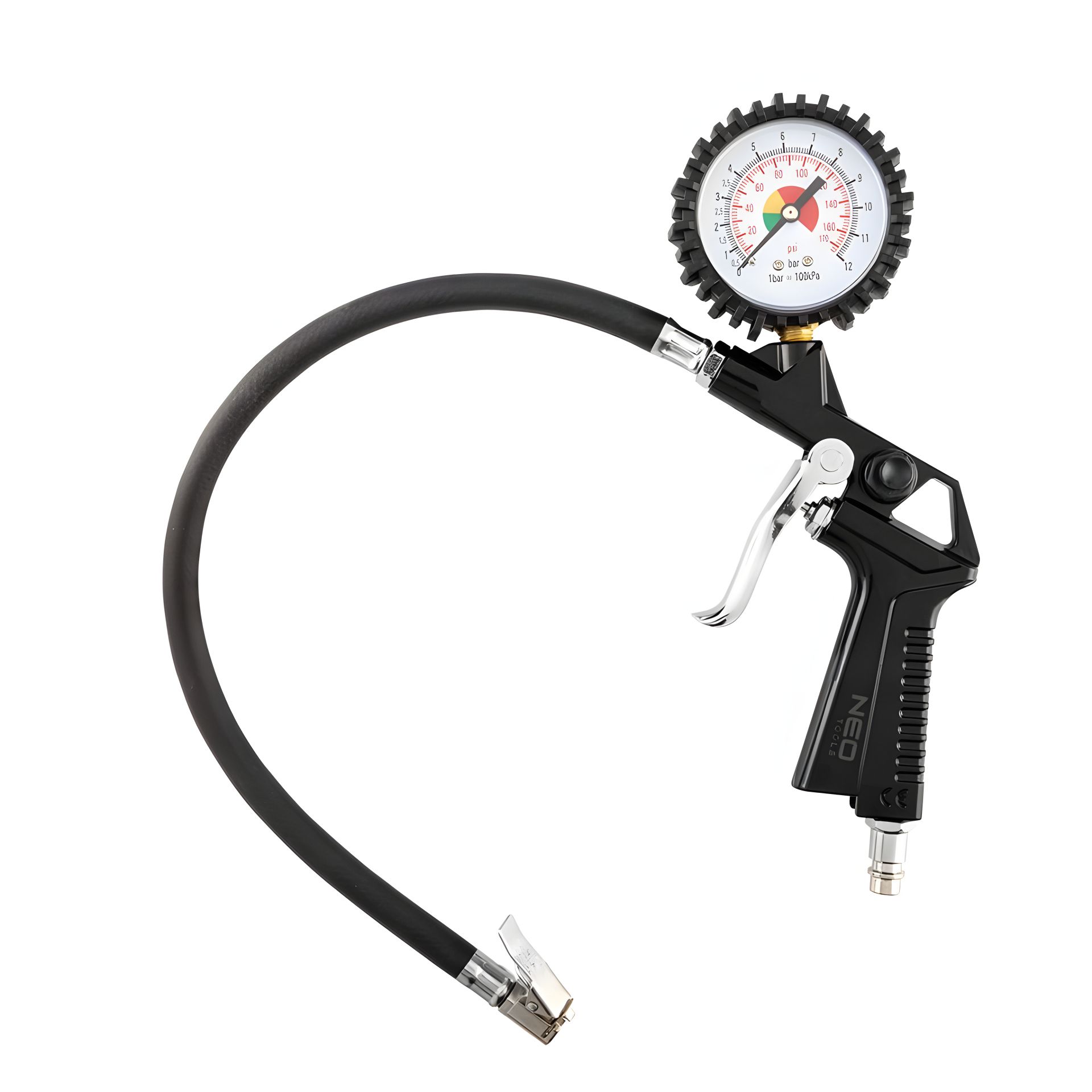 Пістолет для накачування з манометром NEO 14-714, NEO TOOLS виготовлений із алюмінію. Максимальний робочий тиск 12 БАР. Має практичний гачок для підвішування та шланг довжиною 300 мм. Інструментом можна керувати однією рукою (впускати та випускати повітря).