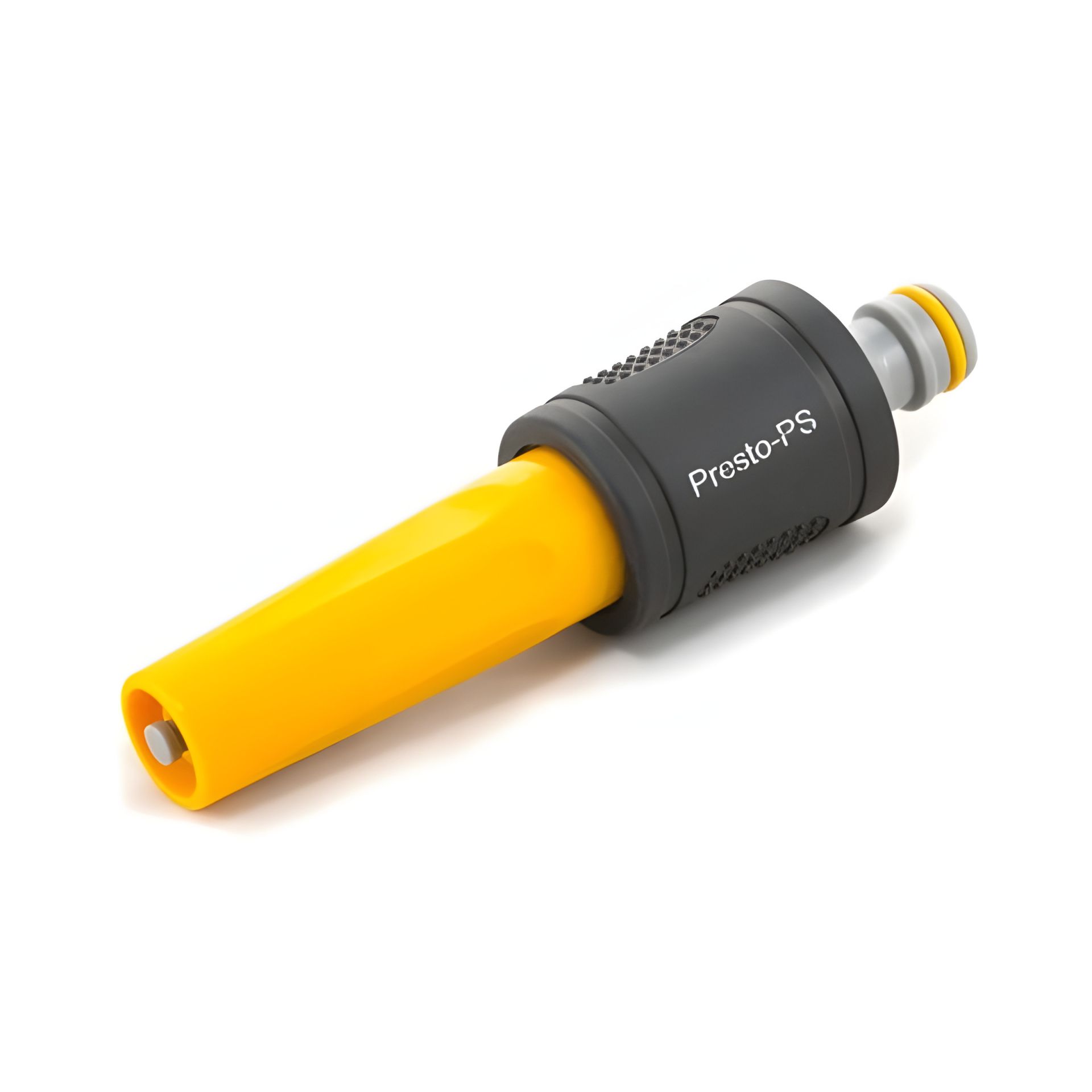 Пістолет для поливу брандспойт Presto-PS (2014) використовується для ручного поливу газонів невеликої площі, міст, квітників, прибирання доріжок на прибудинковій території, миття садового інвентарю та техніки. Поворотна головка пістолета має 3 положення та регулює форму струменя та ступінь розпилення води. Можливий режим роботи: струмінь, конус, туман. Підключається до садових шлангів діаметром 1/2, 5/8 та 3/4 дюйма за допомогою стандартних конекторів. Рекомендований робочий тиск у системі від 2 до 4 атмосфер. Виготовлений поливальний пістолет із пластику з гумовим покриттям Soft-Touch, стійкий до механічних пошкоджень, впливу ультрафіолету та водорозчинних удобрень.