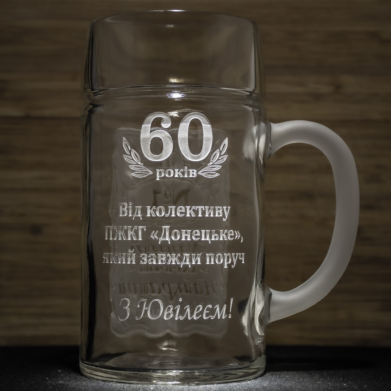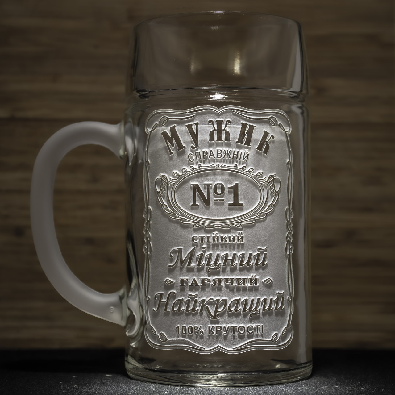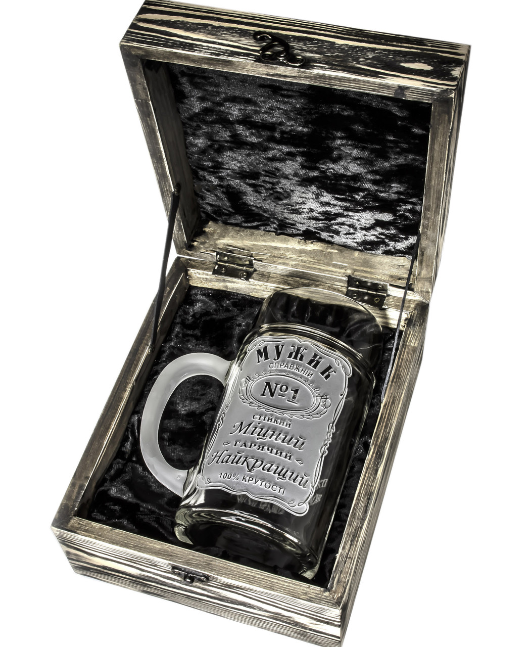 Пивний келих з гравіюванням Мужик №1 в дерев'яній подарунковій скриньці 1Л