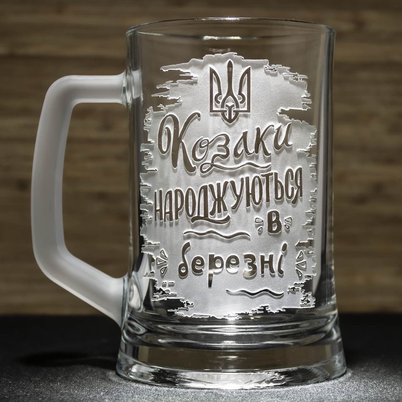 Пивний келих з гравіюванням напису Козаки народжуються в березні
