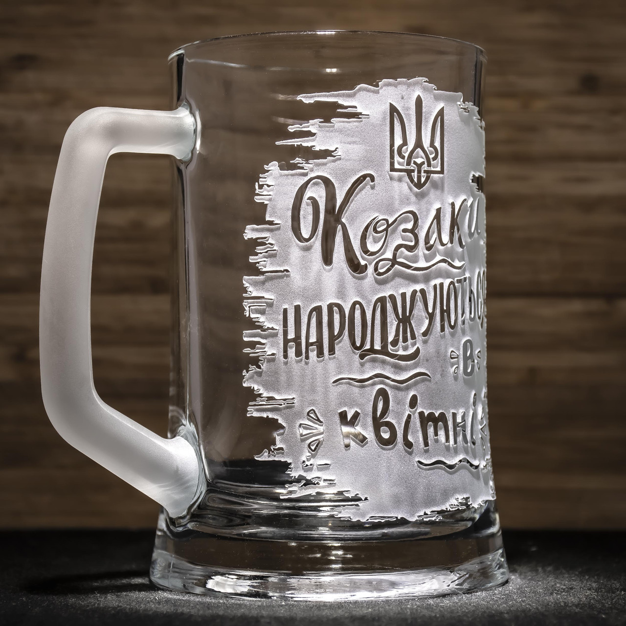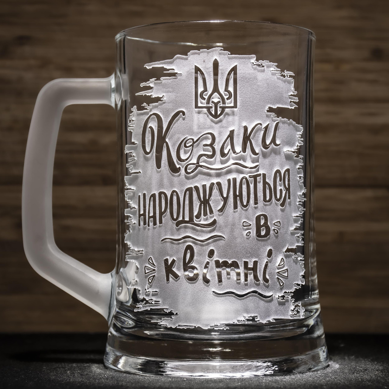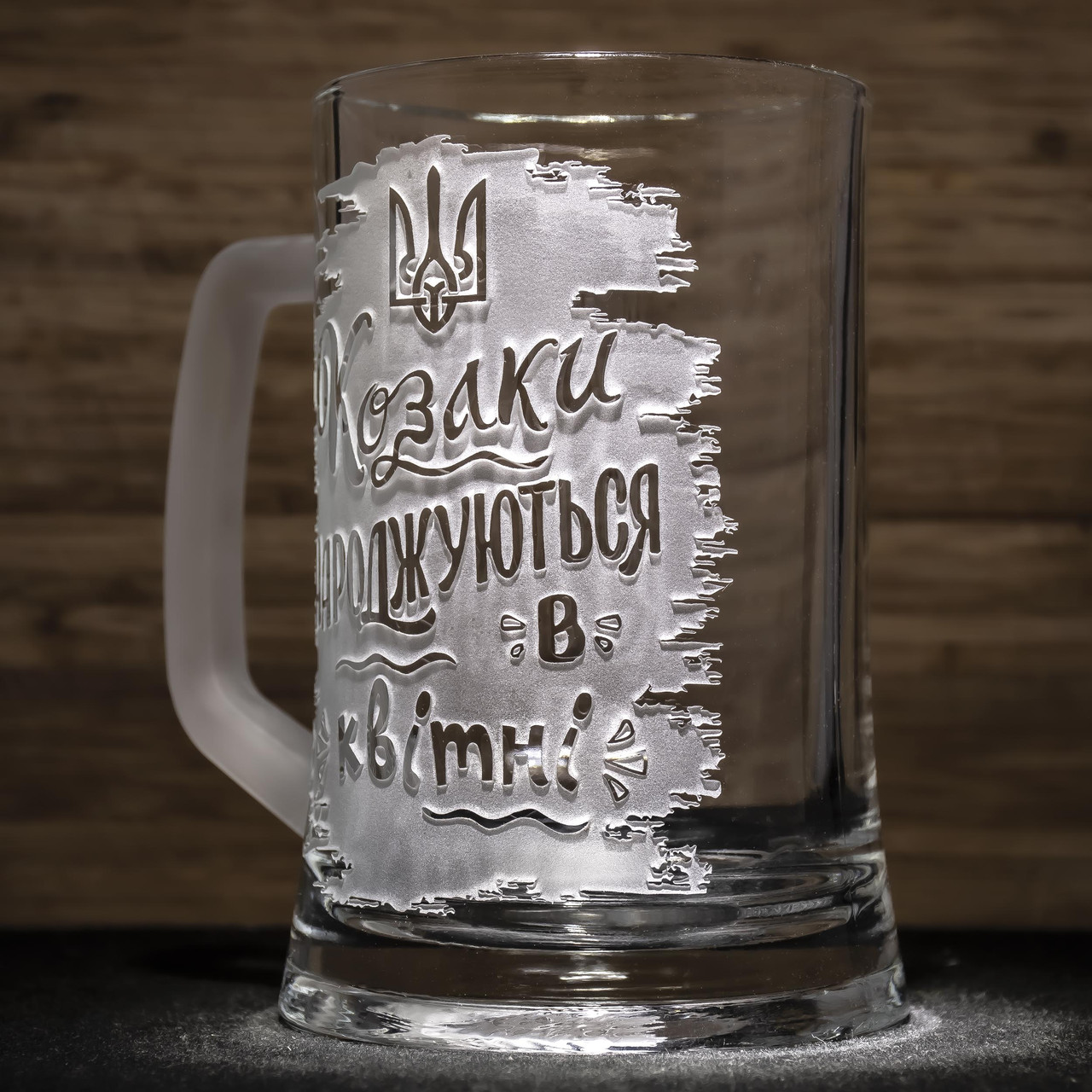 Пивний келих з гравіюванням напису Козаки народжуються в квітні