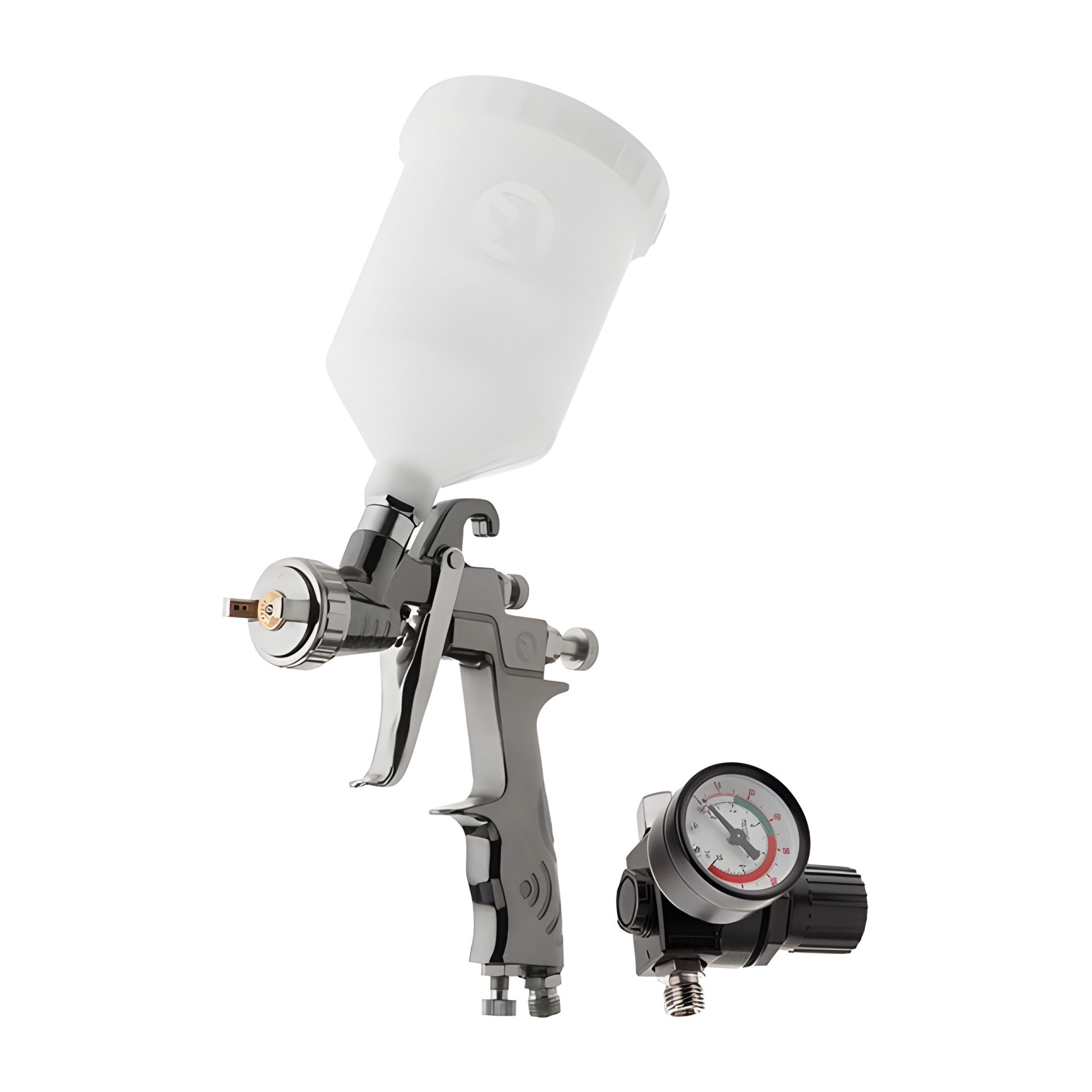 Також у комплекті передбачений редуктор з манометром, за допомогою якого ви зможете відрегулювати тиск повітря на вході до пневмоінструмента.