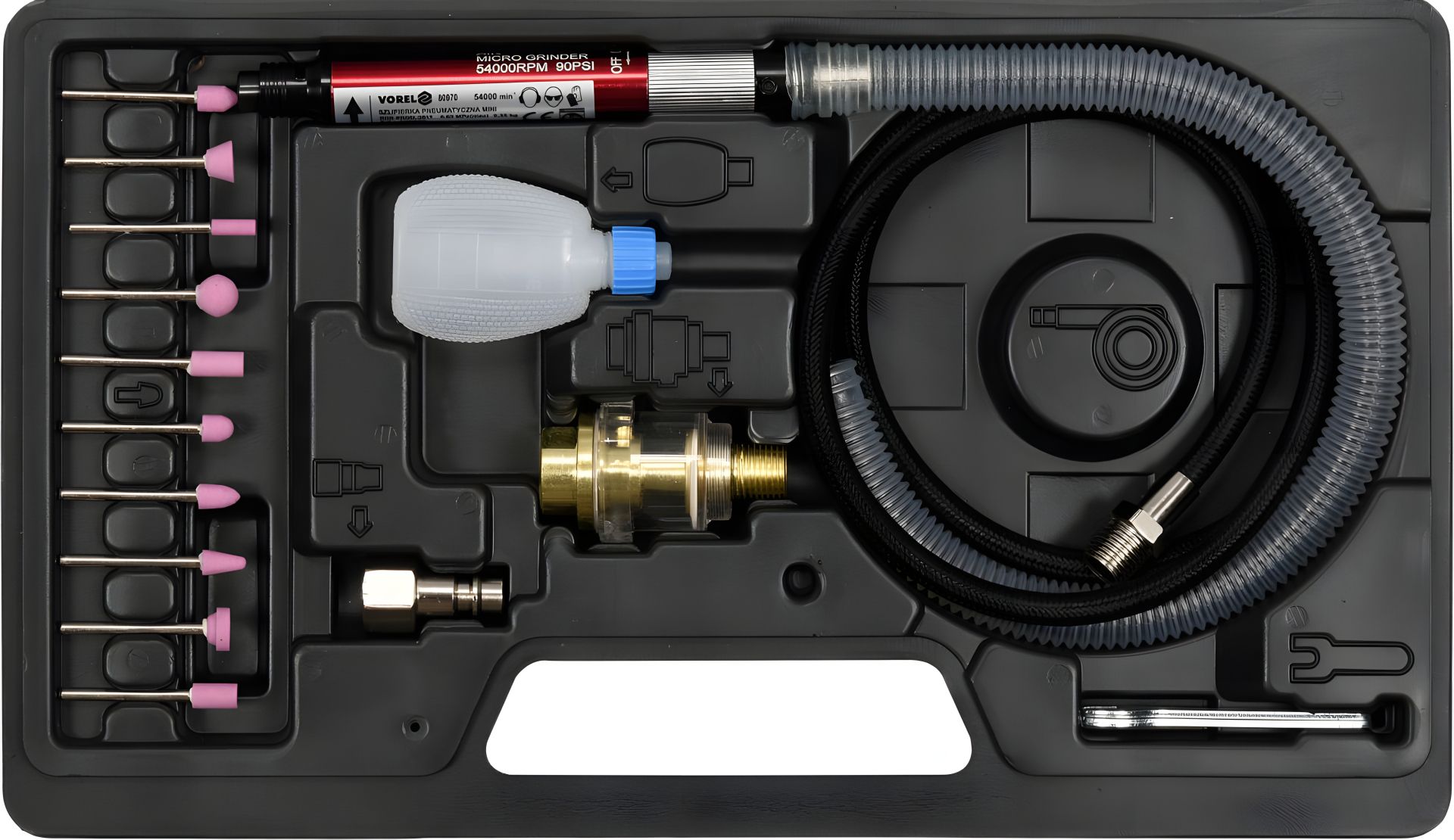Шліфмашина пневматична VOREL міні, при тиску - 0.63 MPa, сопло Ø=3 мм, з насадками 16 елементів