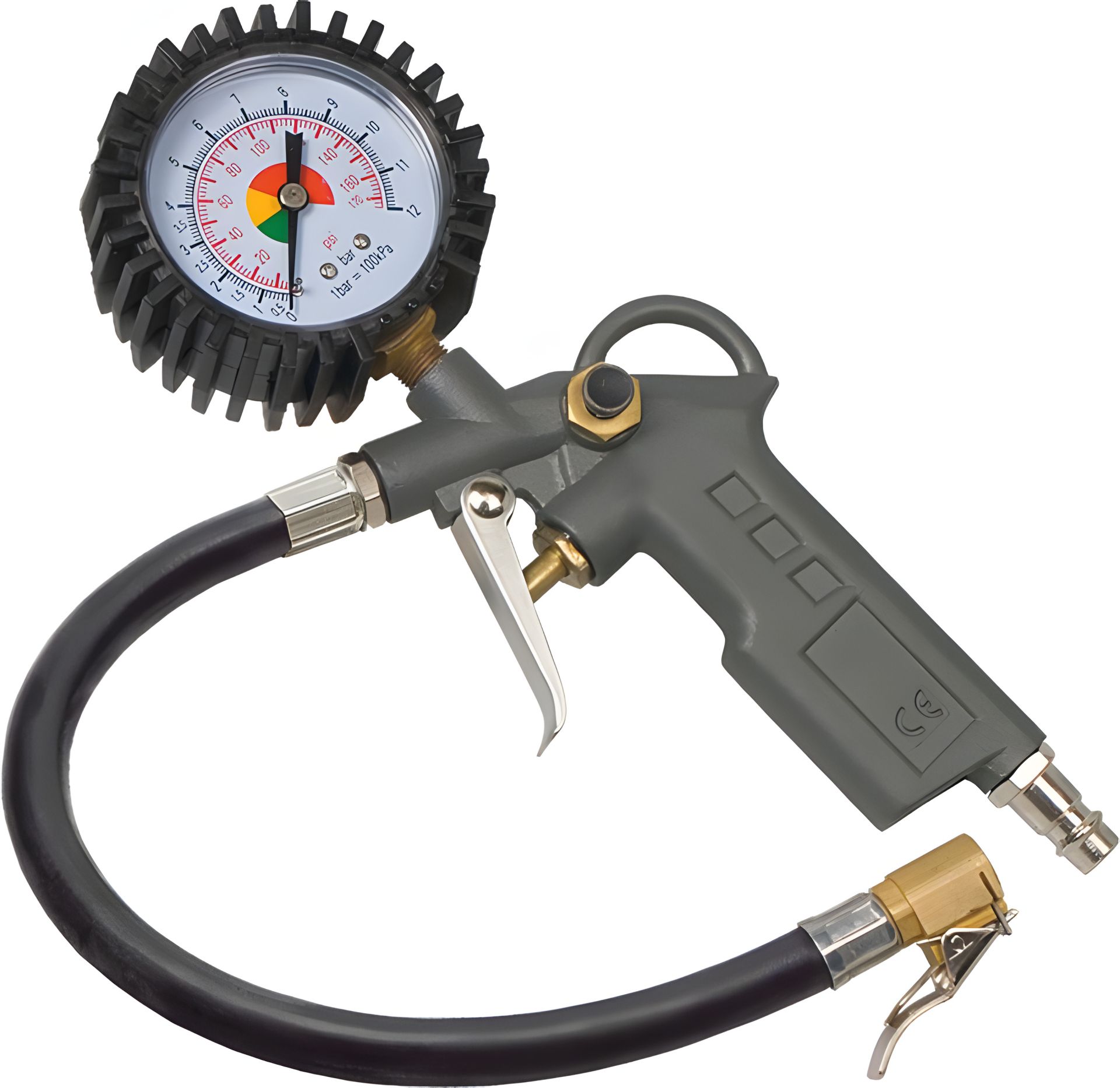 Дозволяє вимірювати тиск повітря в колесах у момент підкачування. Манометр гумовий діаметром 60 мм, довжина шланга - 35 см, латунна головка на підкачування. Подвійне градуювання шкали: 0-12 bar та 0-174 psi.