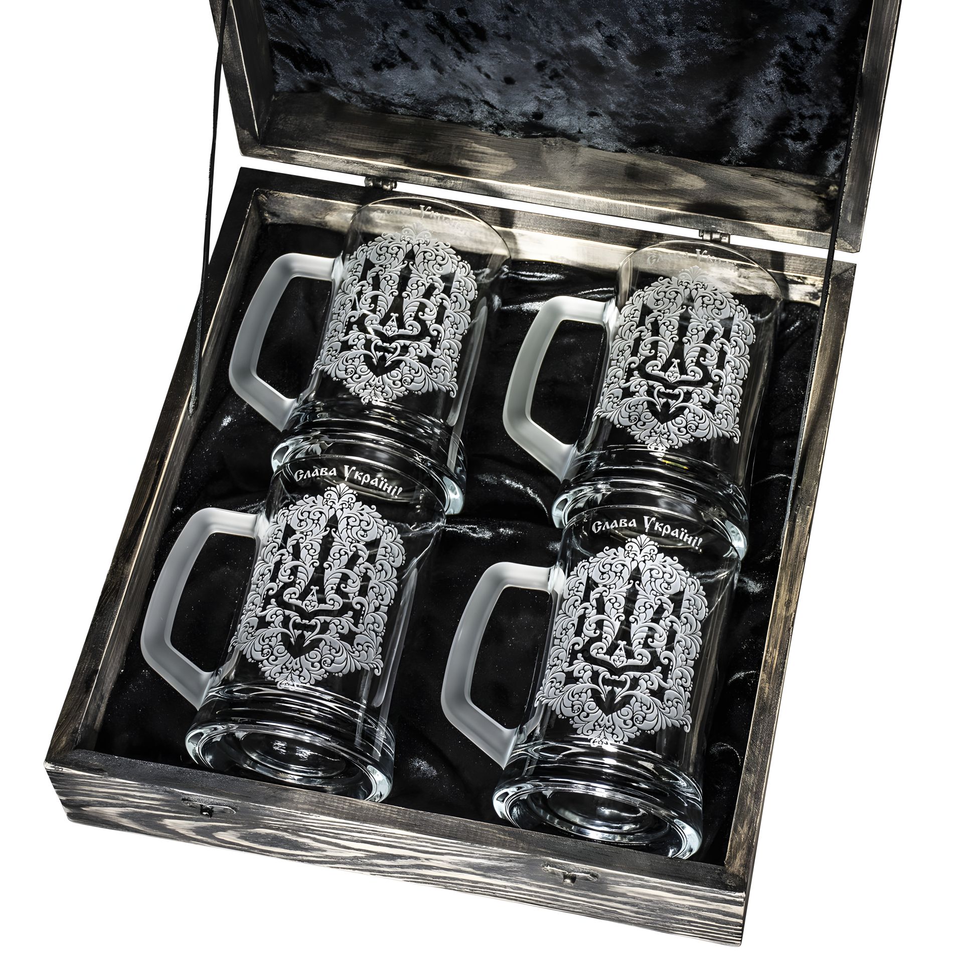 Набір із 4-х келихів для пива з дизайном на Ваш вибір з ручним механічним гравіюванням в подарунковій дерев'яній коробці.