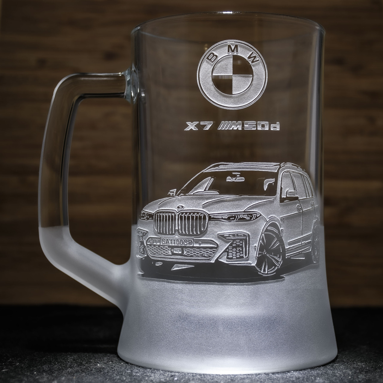 Представляємо вам унікальну пивну кружку з гравіюванням зображення автомобіля BMW X7 з матовою ручкою. Кружка є ідеальним подарунком для любителів марки BMW. Зображення нанесено на поверхню скла за допомогою методу гравіювання, який має безліч переваг.